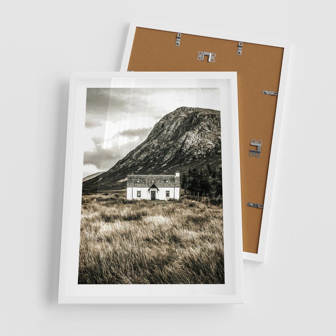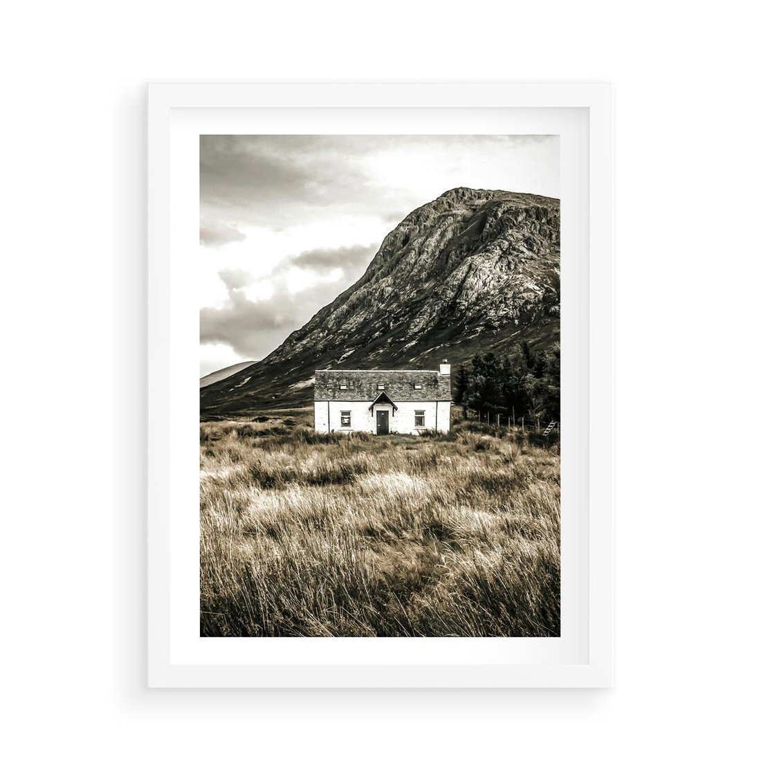 Plakat w ramie 50x70 - Biały Domek w Sepii: Wiejski Urok - domek w górach, kolory sepii - rama biała