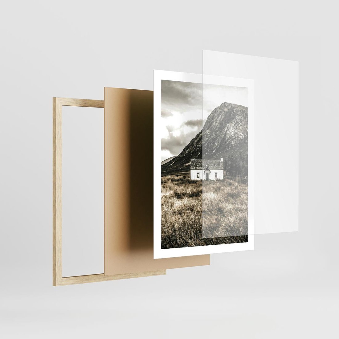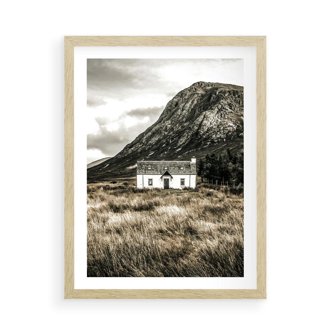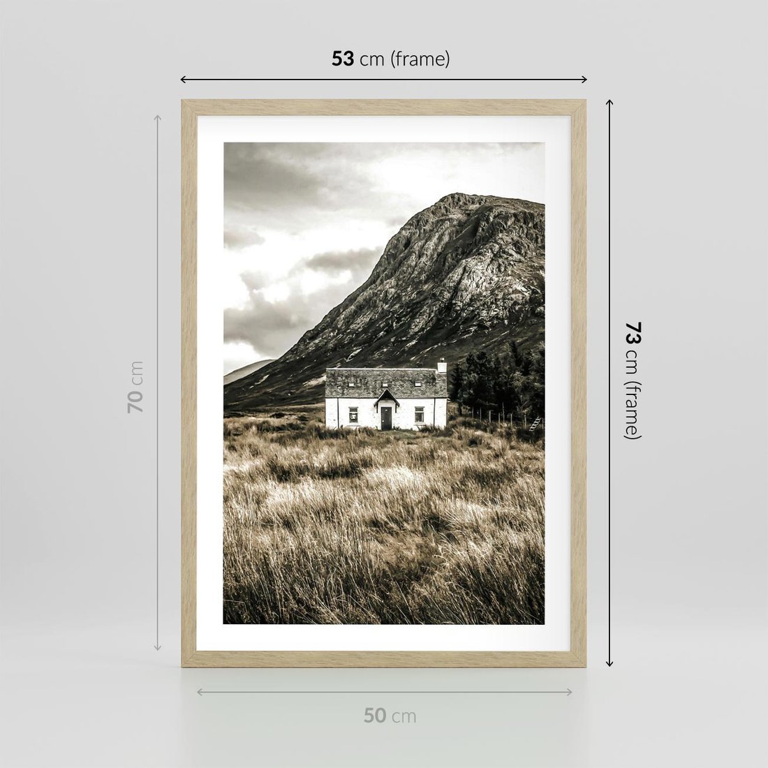 Plakat w ramie 50x70 - Biały Domek w Sepii: Wiejski Urok - domek w górach, kolory sepii - rama drewno