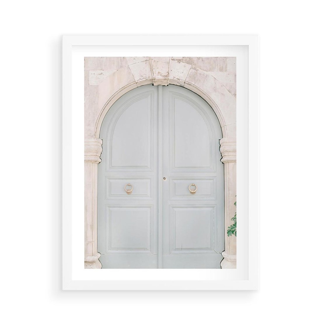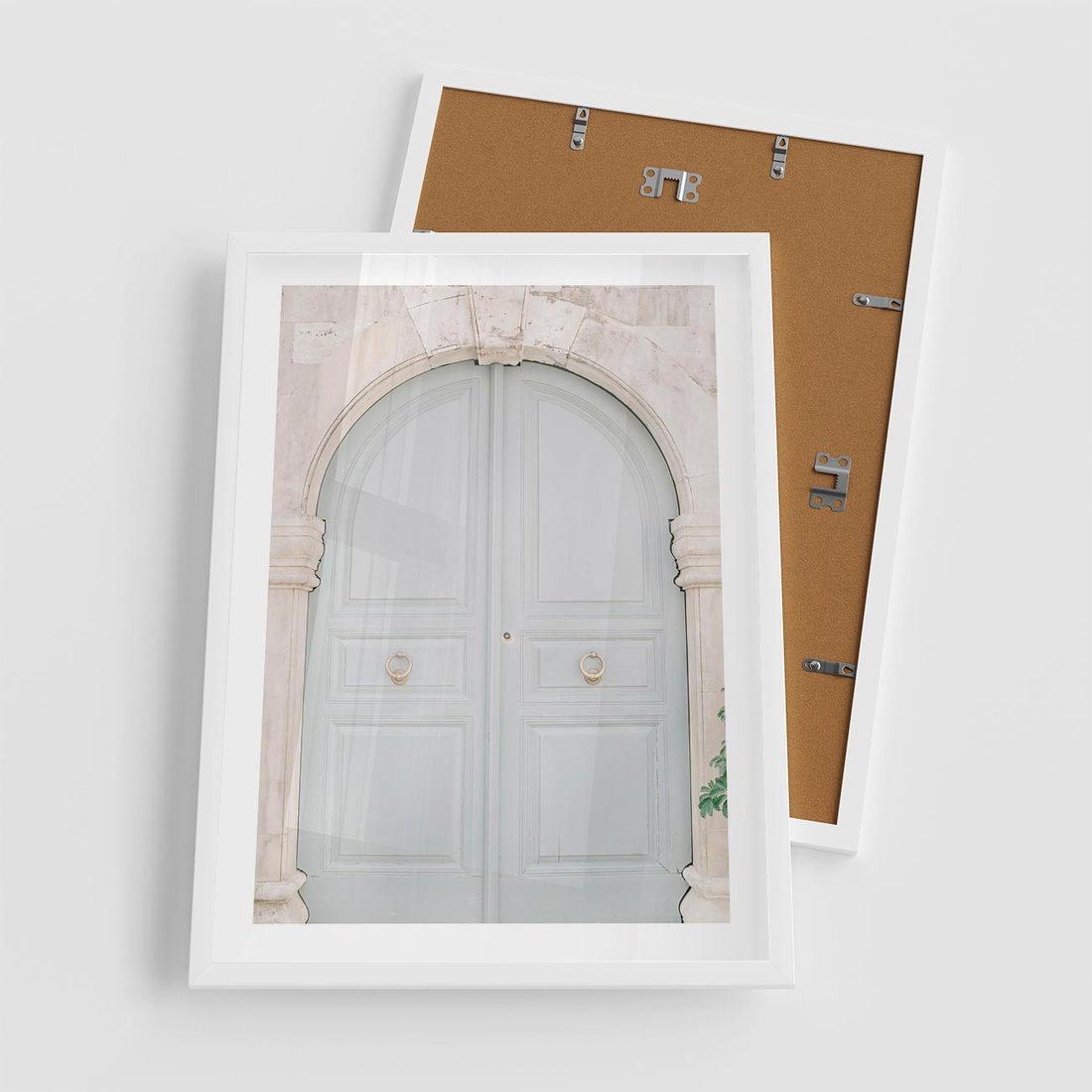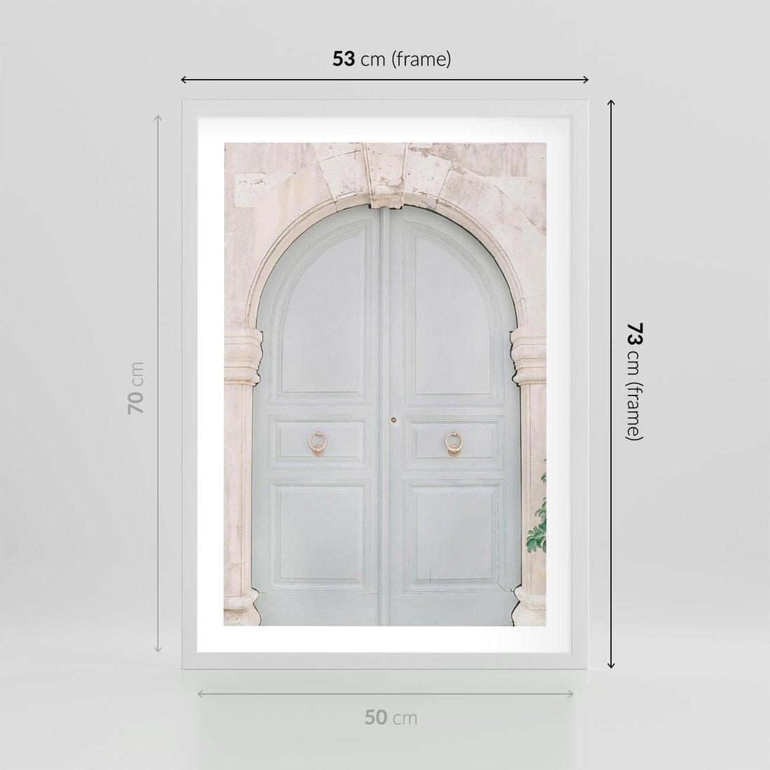 Plakat w ramie 50x70 - Błękitne Drzwi Kamienicy: Urok Historii - stare piękne drzwi do kamienicy, błękitne drzwi - rama biała