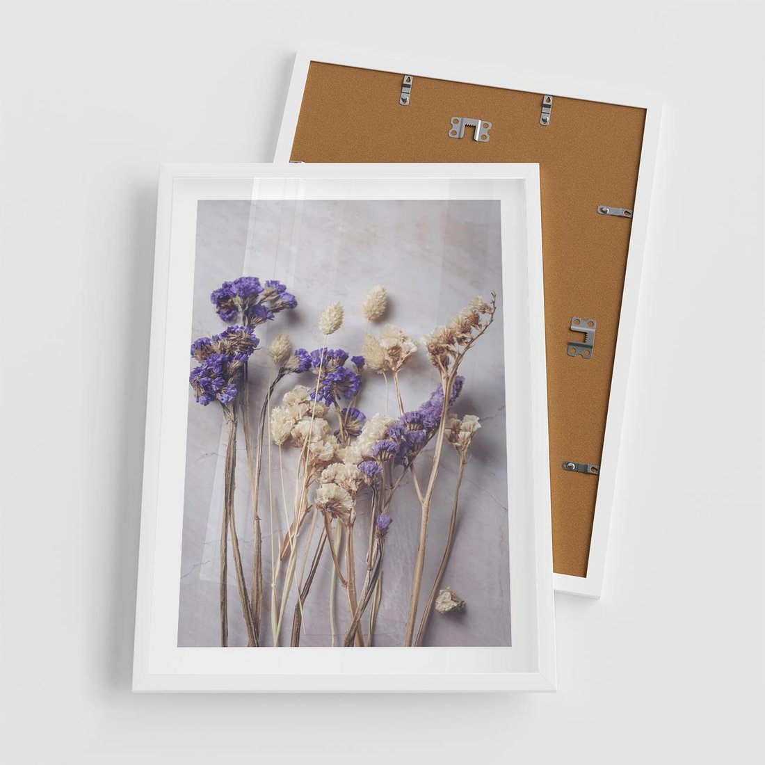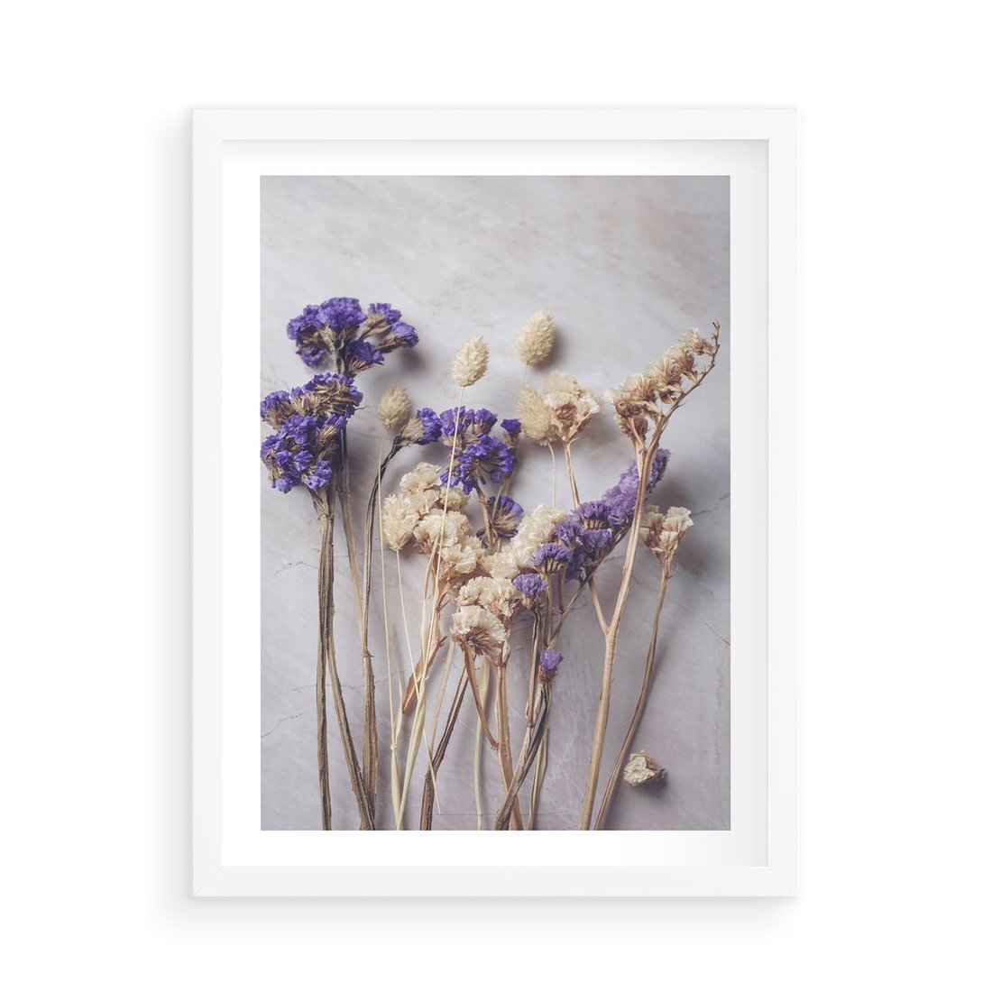 Obraz przedstawia delikatną kompozycję z suszonymi błękitnymi i białymi kwiatami. Ta artystyczna kompozycja idealnie pasuje do wnętrz o romantycznym lub minimalistycznym charakterze, dodając subtelny i elegancki akcent.