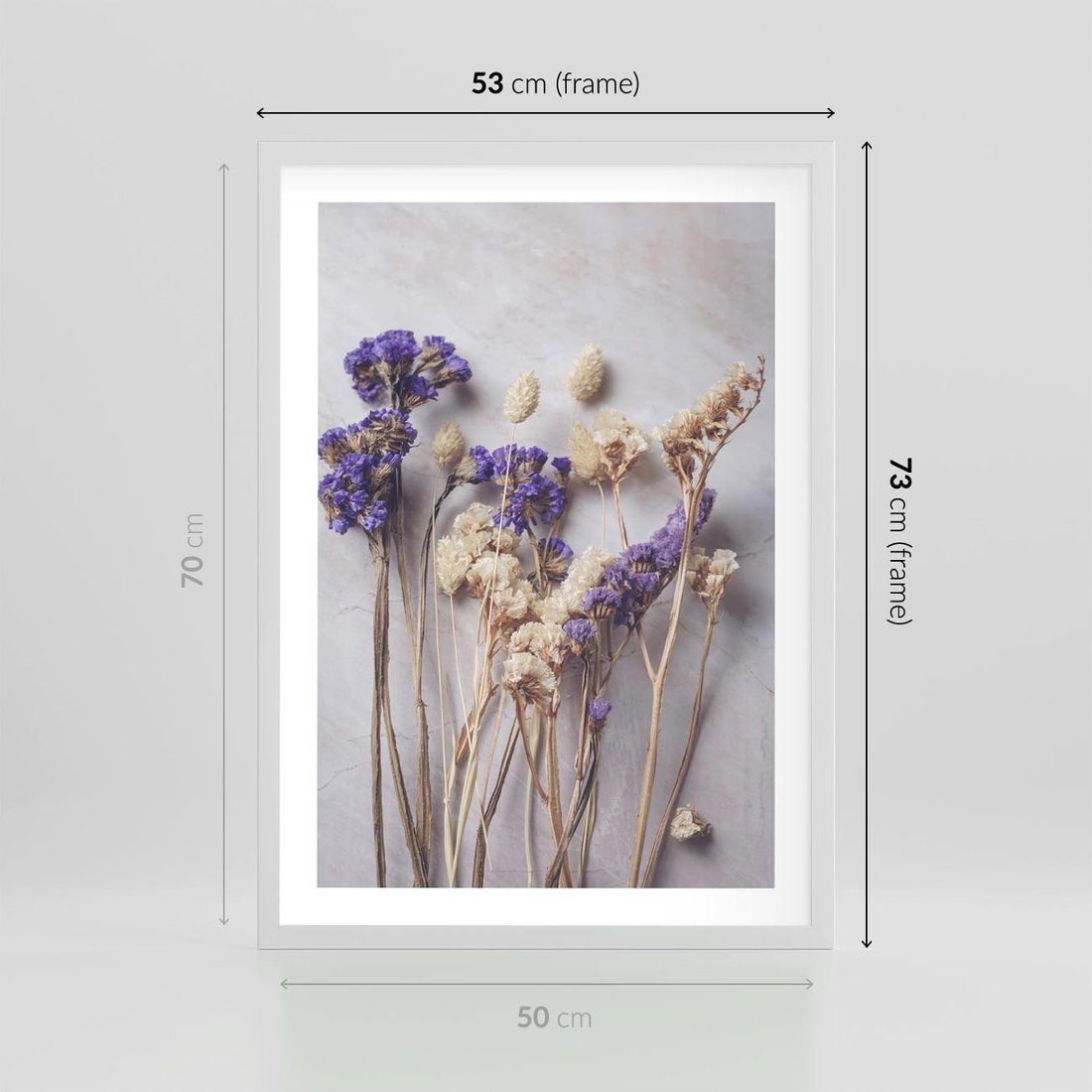 Plakat w ramie 50x70 - Błękitno-Biała Harmonia - suszone kwiaty, błekitne - rama biała