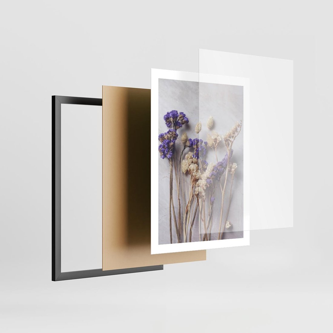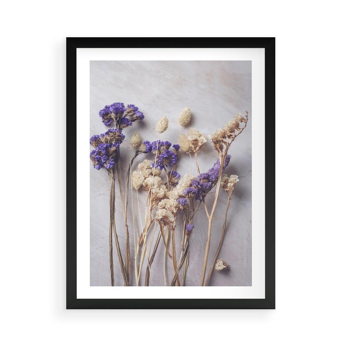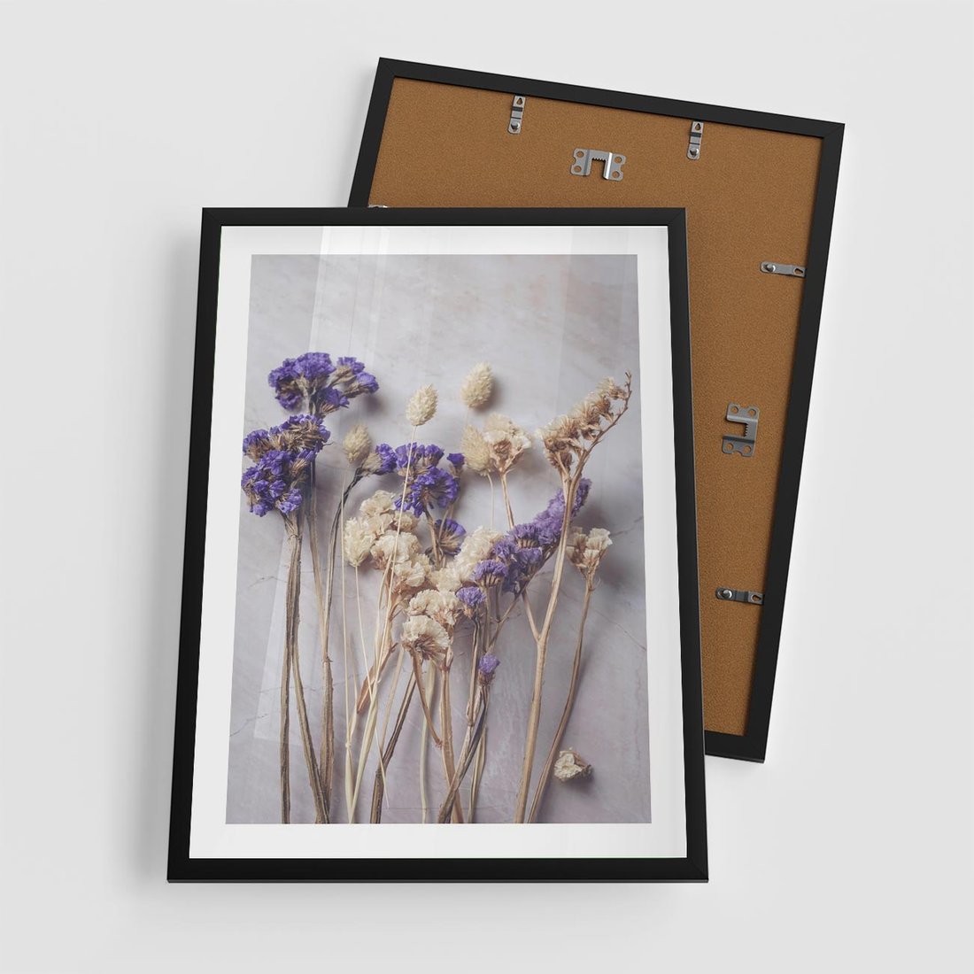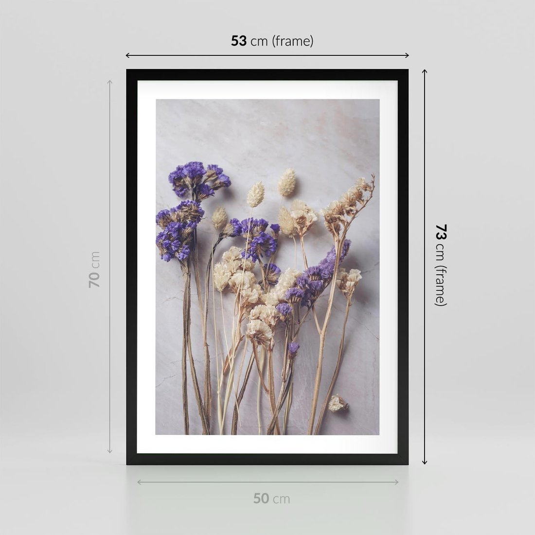 Plakat w ramie 50x70 - Błękitno-Biała Harmonia - suszone kwiaty, błekitne - rama czarna