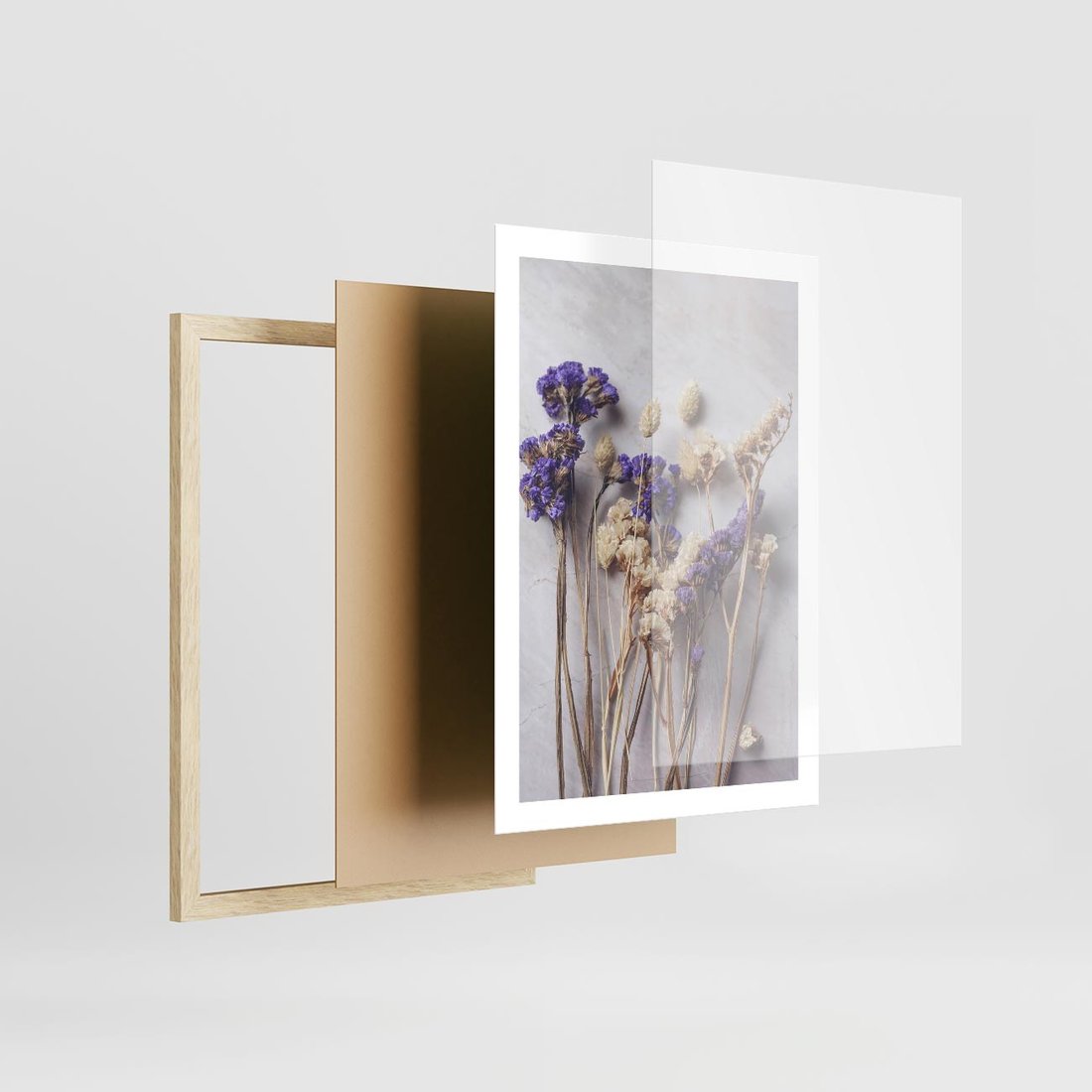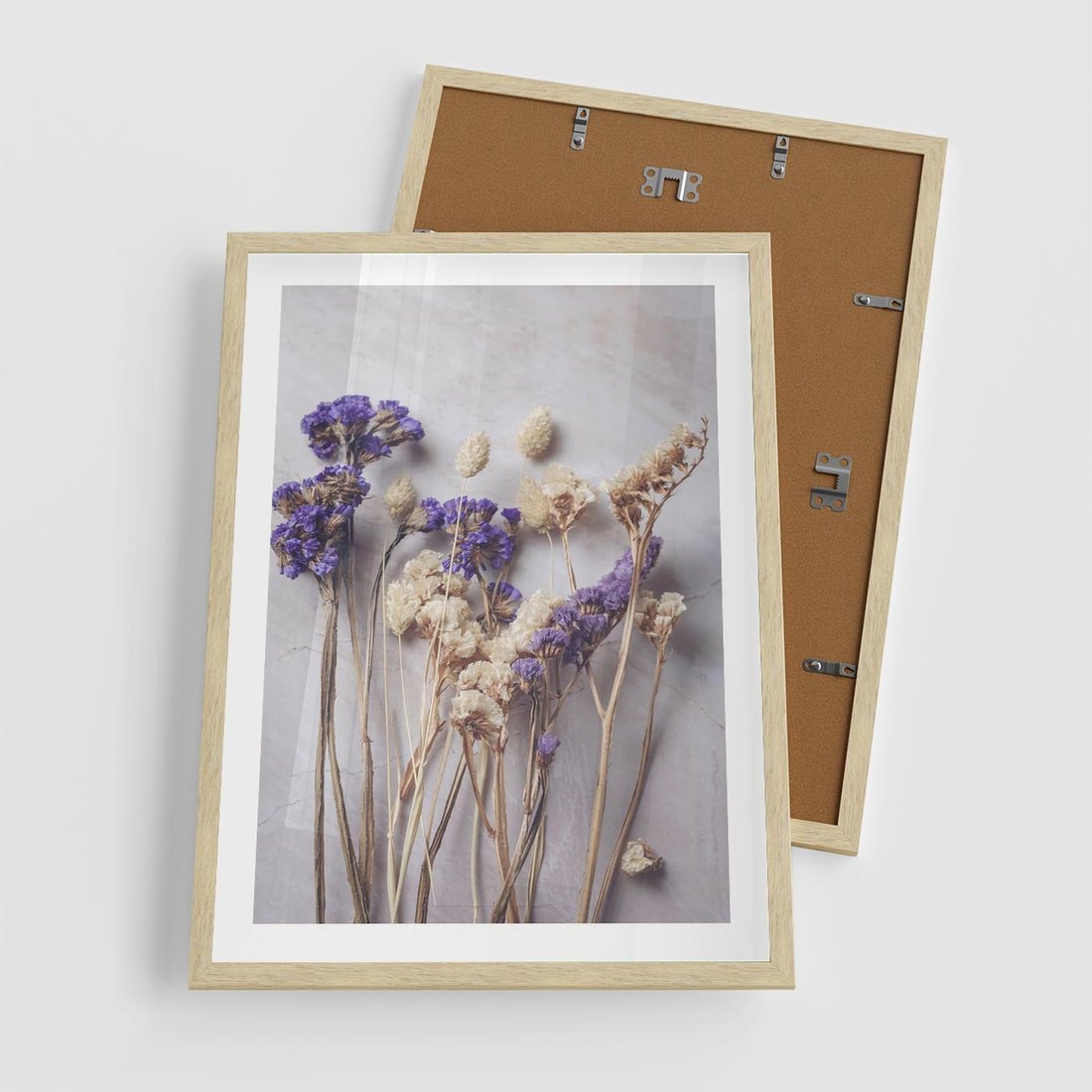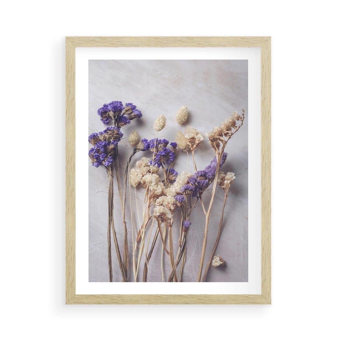 Obraz przedstawia delikatną kompozycję z suszonymi błękitnymi i białymi kwiatami. Ta artystyczna kompozycja idealnie pasuje do wnętrz o romantycznym lub minimalistycznym charakterze, dodając subtelny i elegancki akcent.
