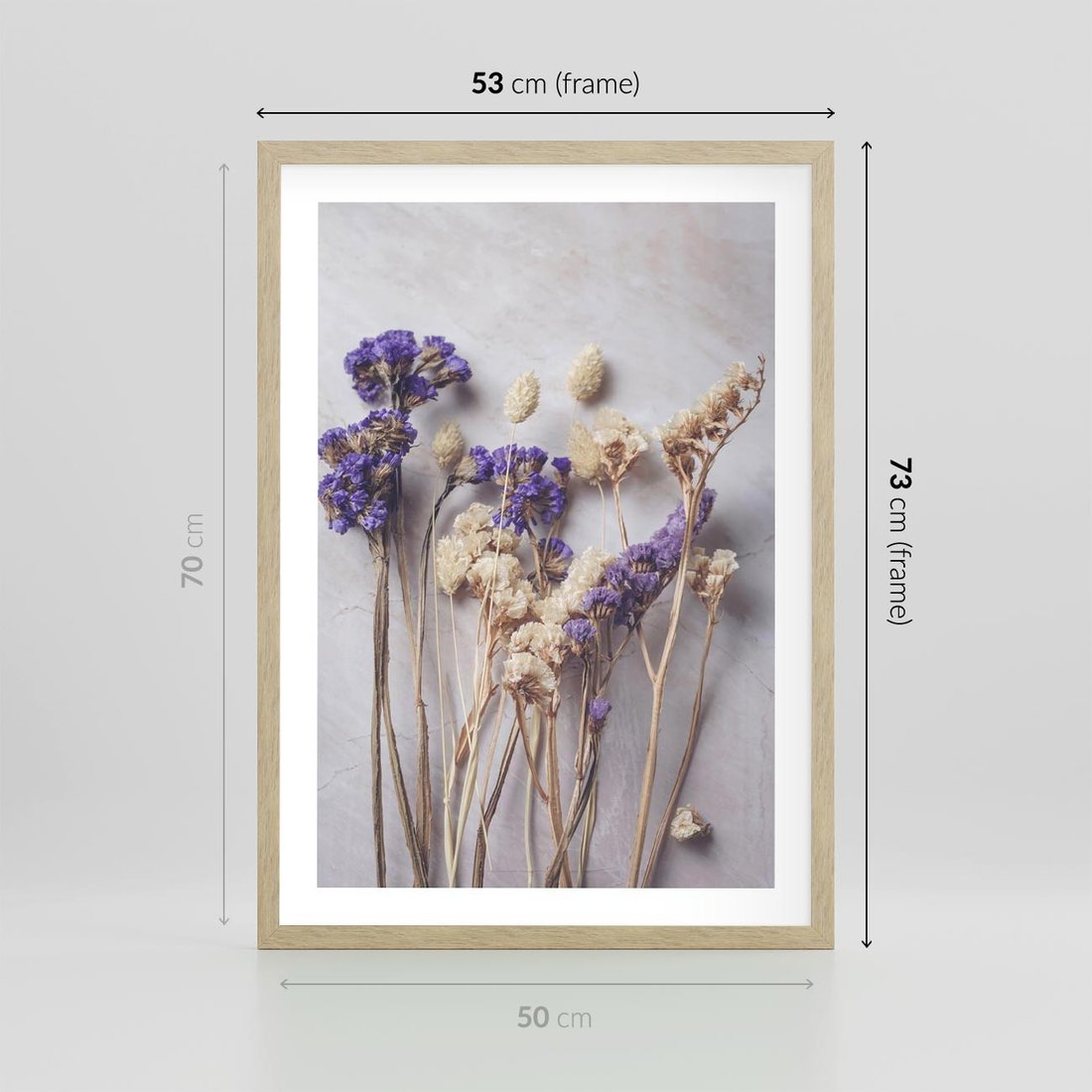 Plakat w ramie 50x70 - Błękitno-Biała Harmonia - suszone kwiaty, błekitne - rama drewno