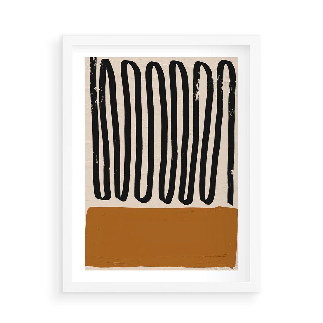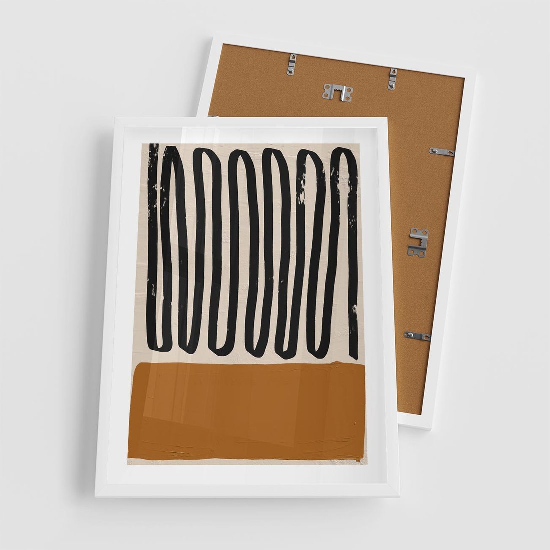Ten abstrakcyjny plakat w odcieniach brązu zachwyca wyrazistymi czarnymi falowanymi liniami, tworząc dynamiczną kompozycję. Idealny dodatek do nowoczesnych wnętrz.