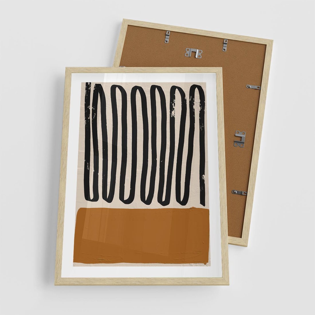 Ten abstrakcyjny plakat w odcieniach brązu zachwyca wyrazistymi czarnymi falowanymi liniami, tworząc dynamiczną kompozycję. Idealny dodatek do nowoczesnych wnętrz.