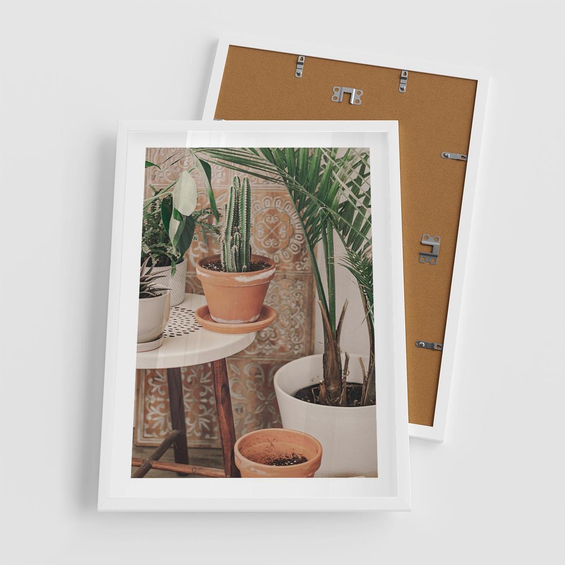 Plakat w ramie 50x70 - Boho Oaza: Kaktusy w Doniczkach - rośliny kaktusy w doniczkach, boho wnętrze - rama biała