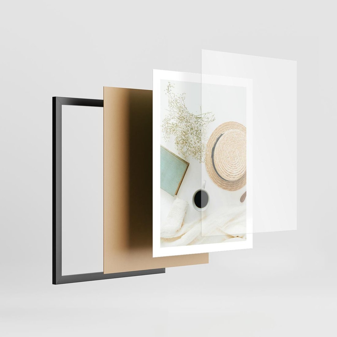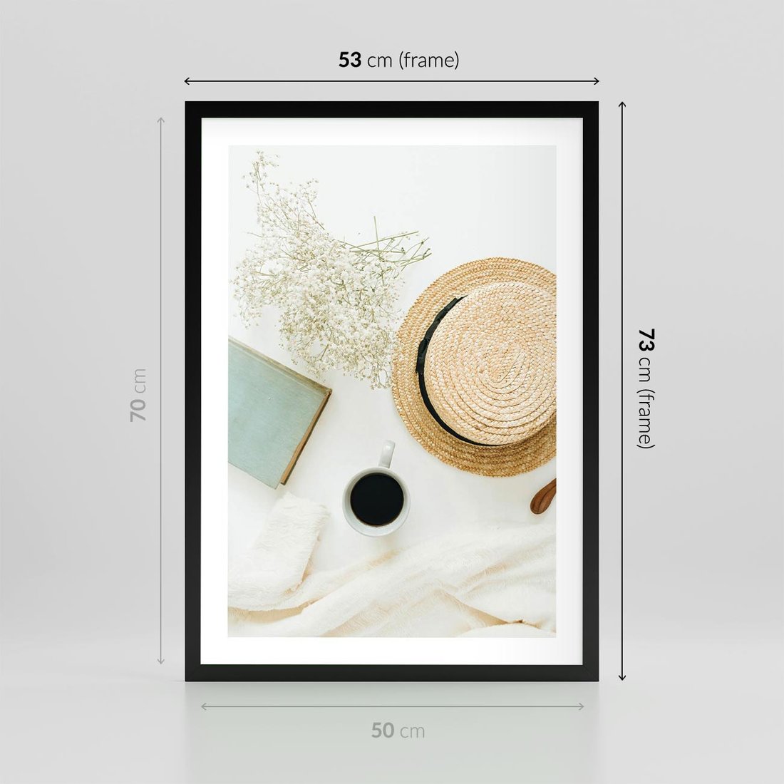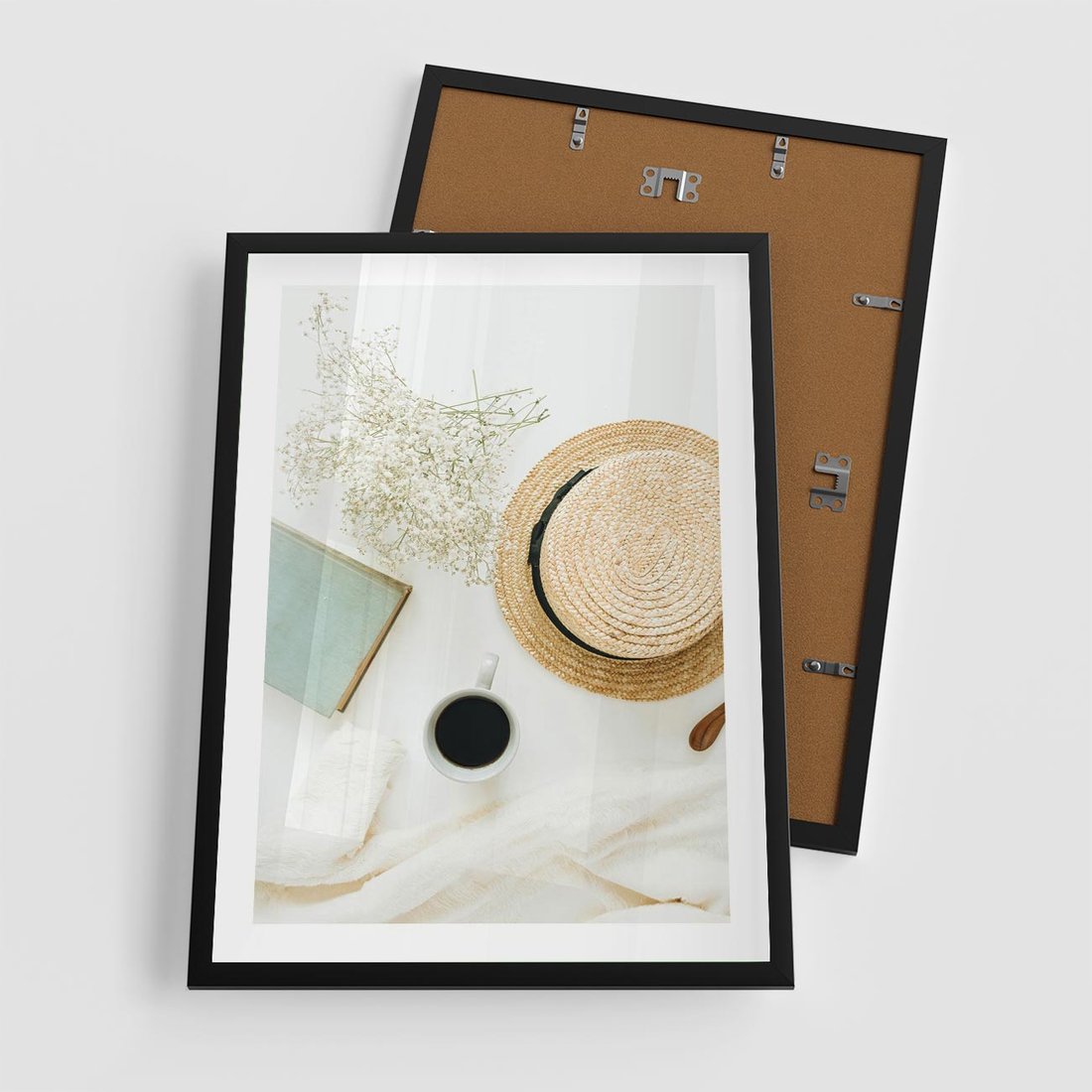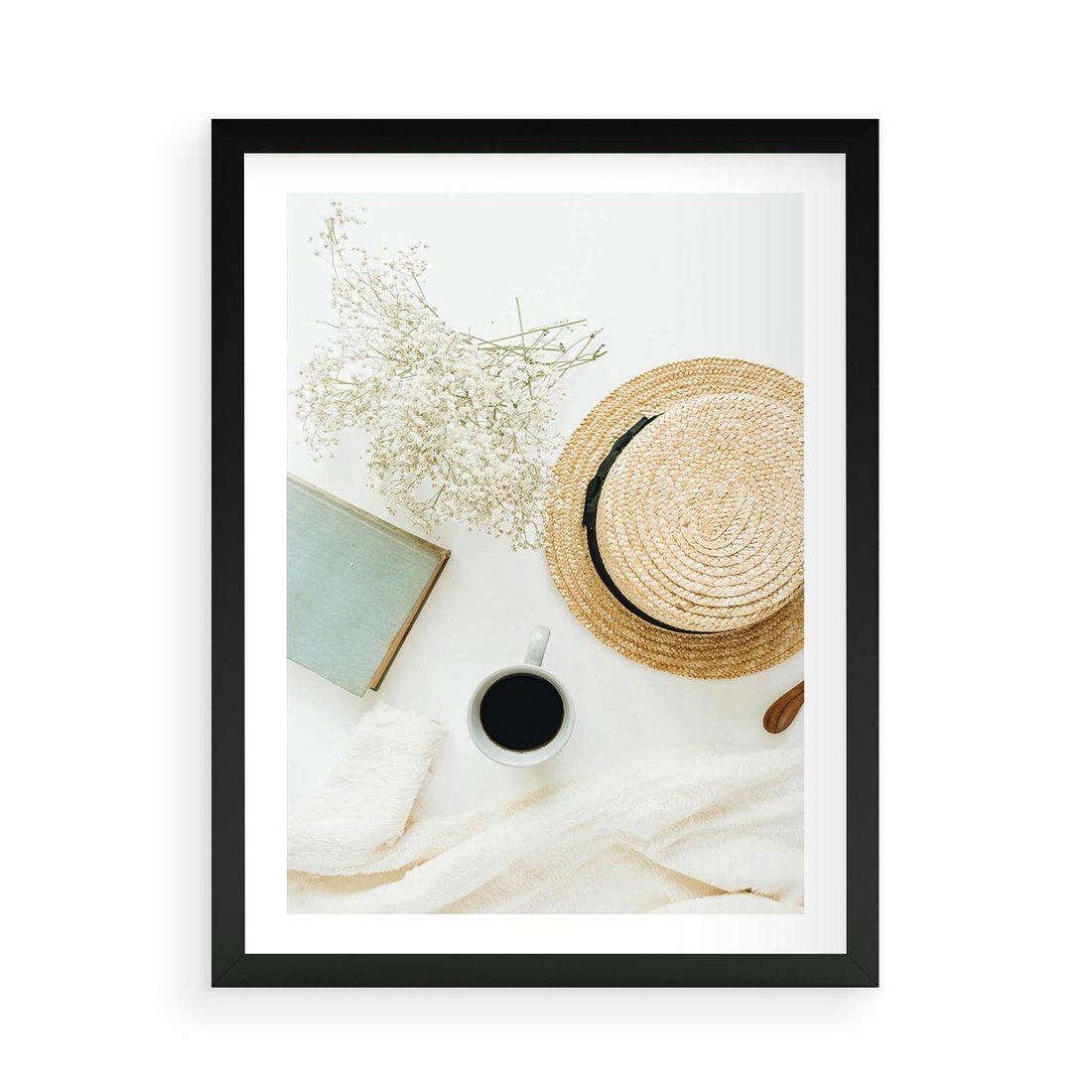 Plakat w ramie 50x70 - Boho Urok - kompozycja boho, slomkowy kapelusz - rama czarna