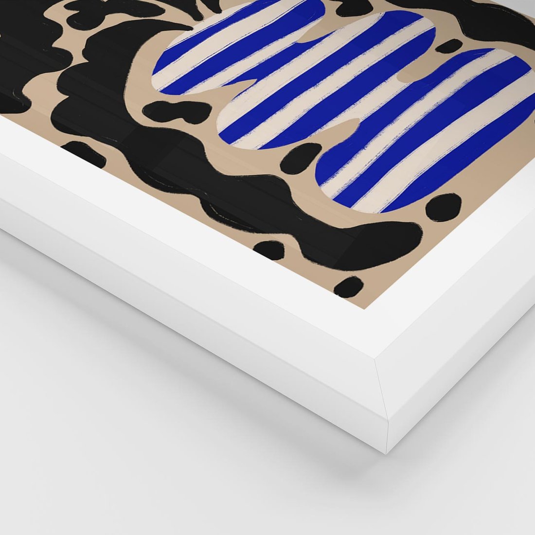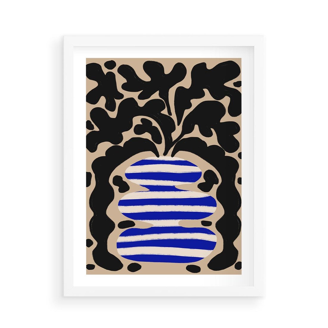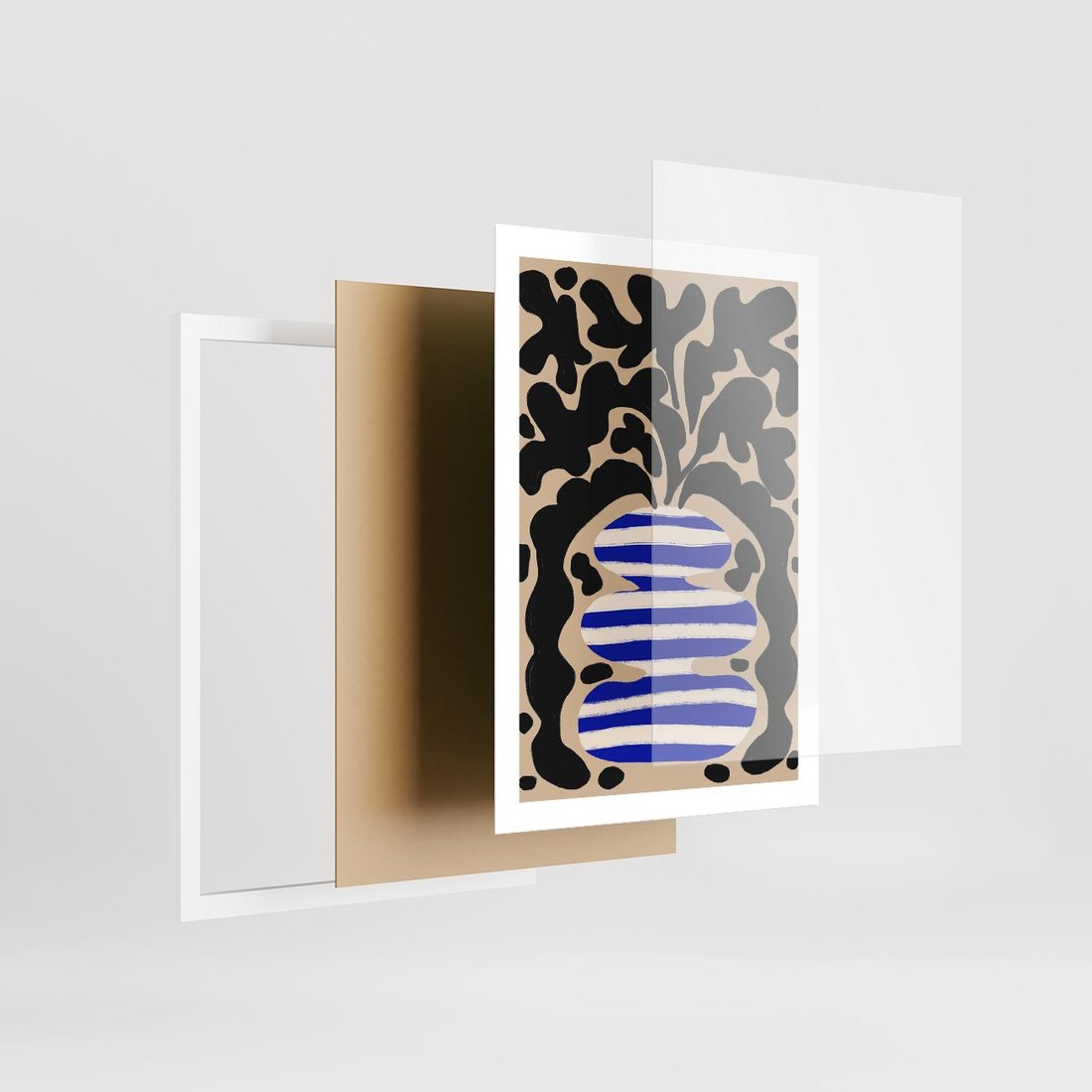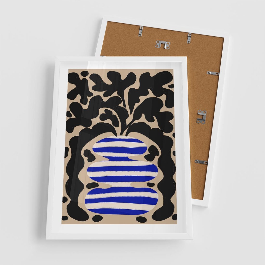 Ten abstrakcyjny plakat prezentuje fascynujące formy, które mogą przypominać wazon w biało-niebieskie pasy, a w nim umieszczone są stylizowane, czarne liście. To wyjątkowy dodatek do każdego wnętrza.