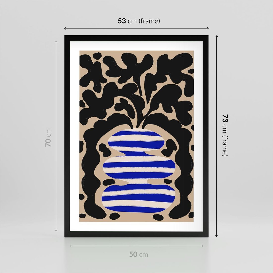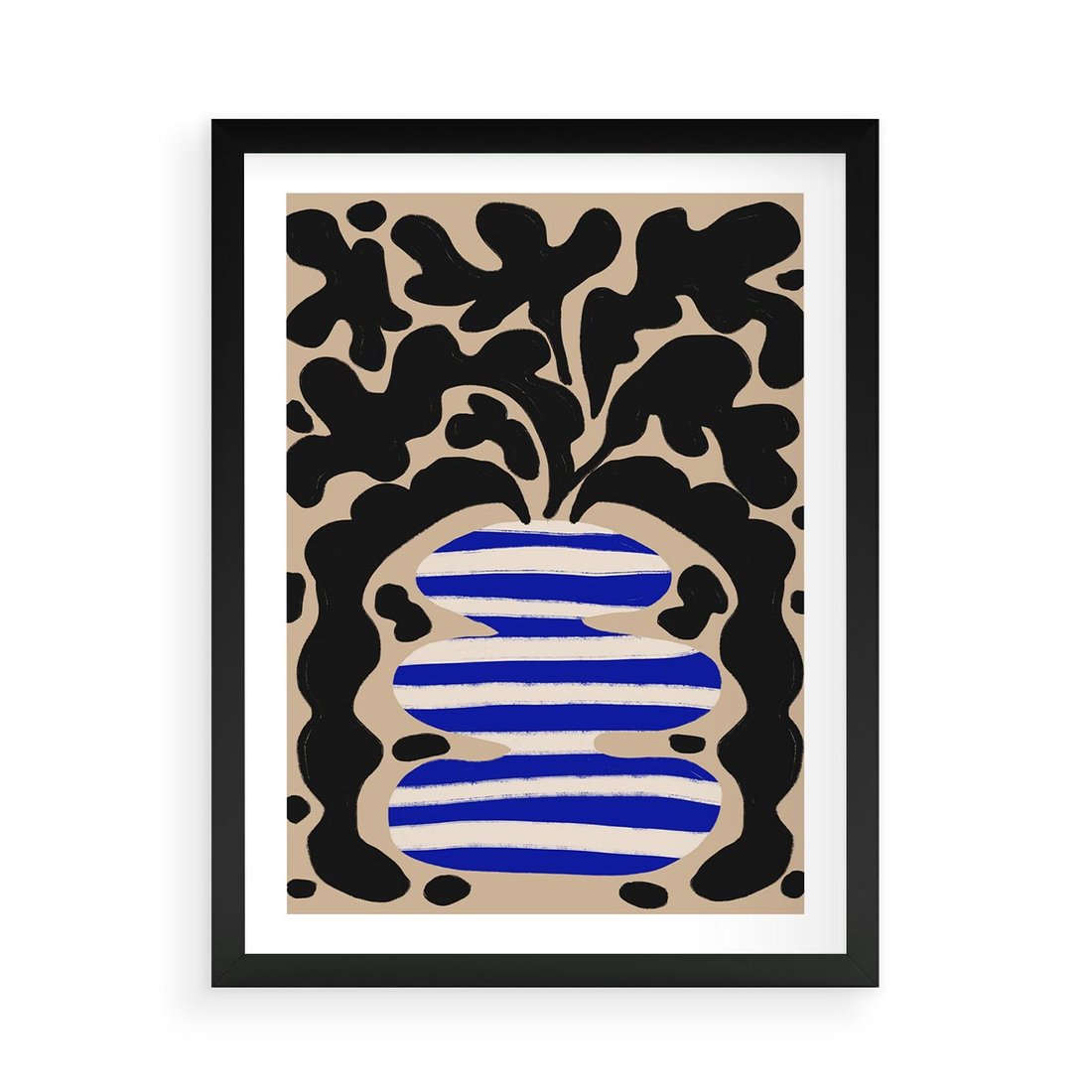 Ten abstrakcyjny plakat prezentuje fascynujące formy, które mogą przypominać wazon w biało-niebieskie pasy, a w nim umieszczone są stylizowane, czarne liście. To wyjątkowy dodatek do każdego wnętrza.