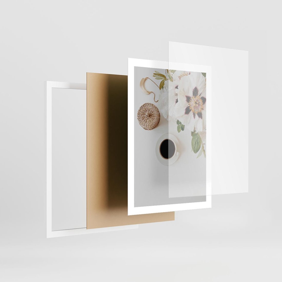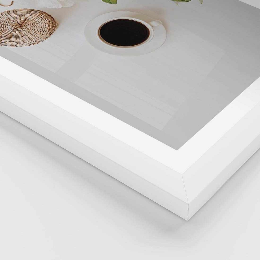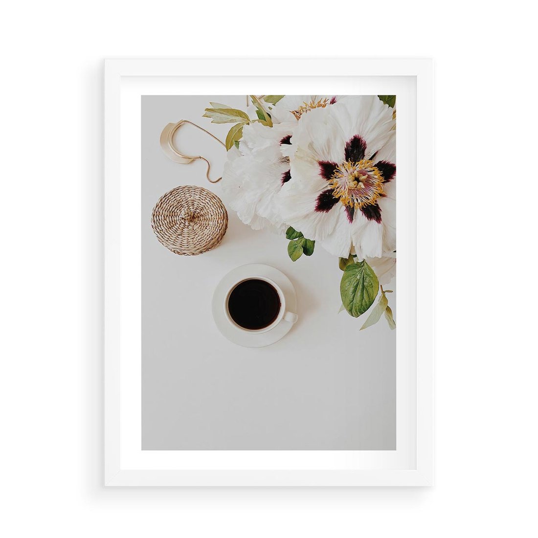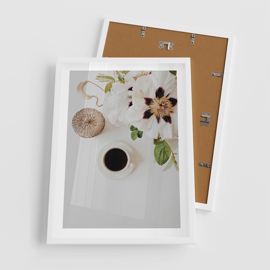 Plakat w ramie 50x70 - Bukiet Kwiatów i Kawa na Stole - fotografia, na stole bukiet - rama biała