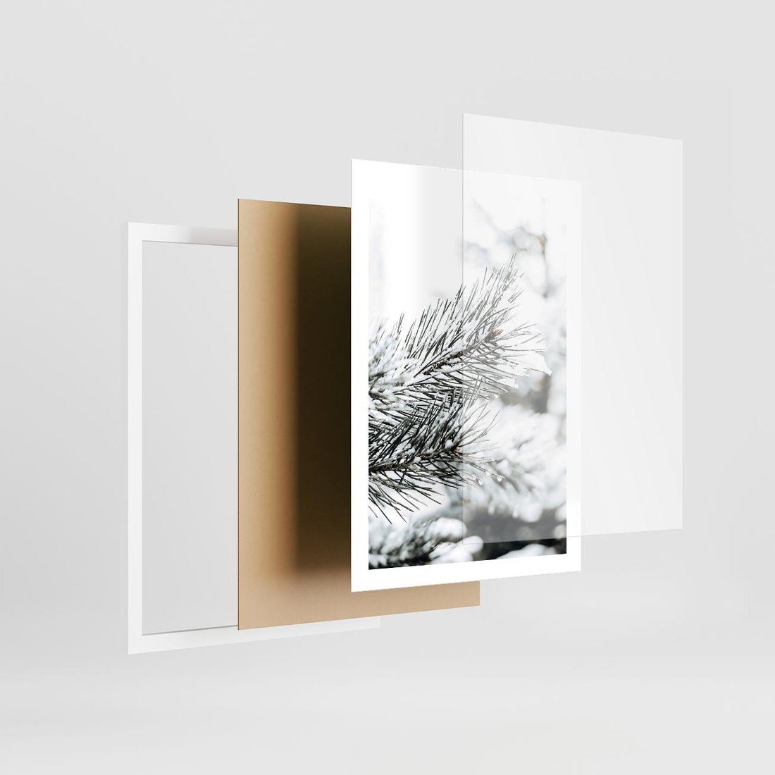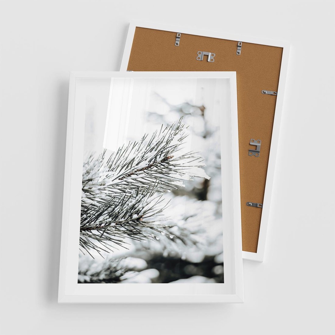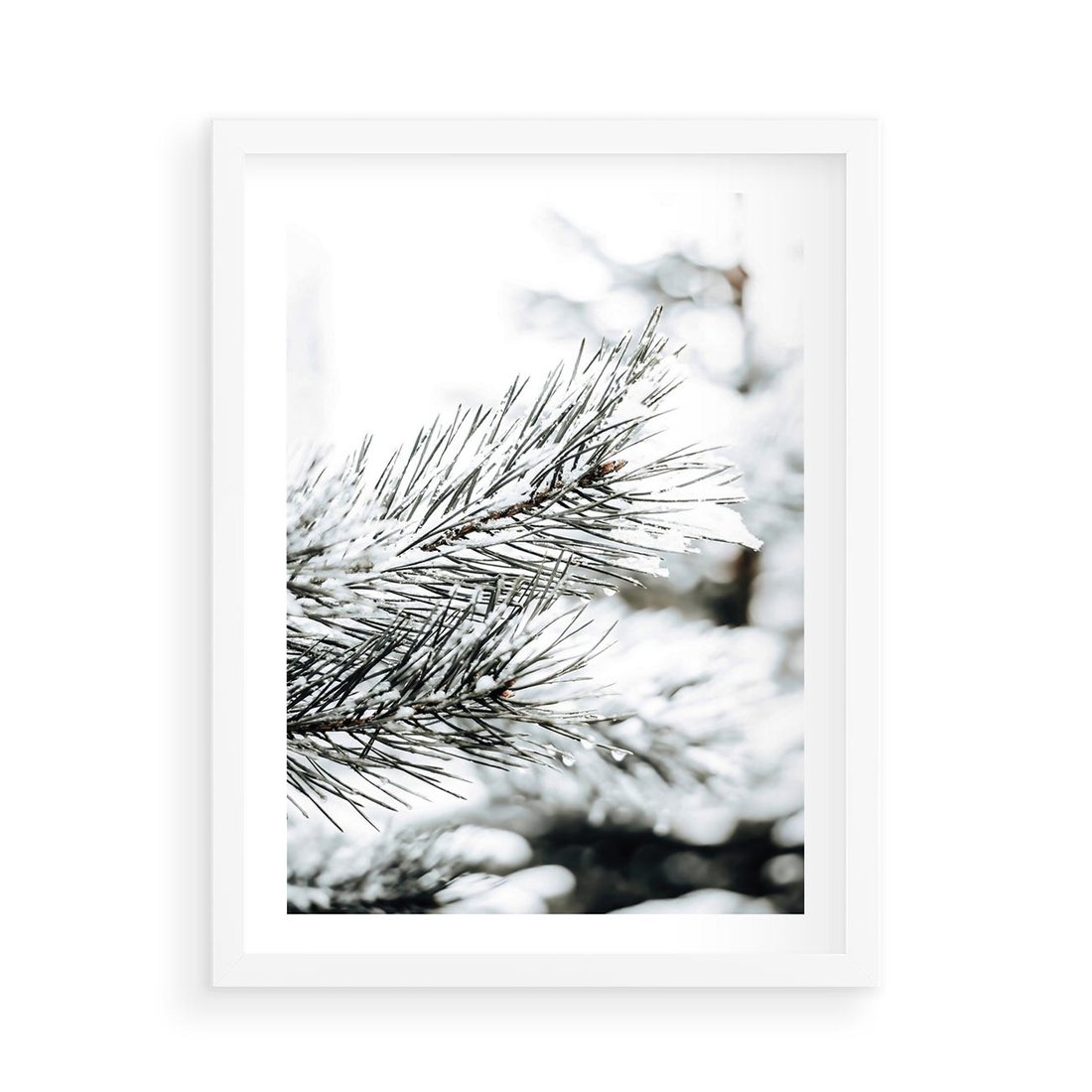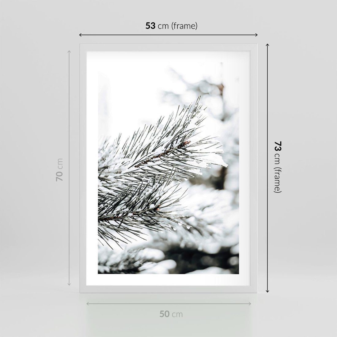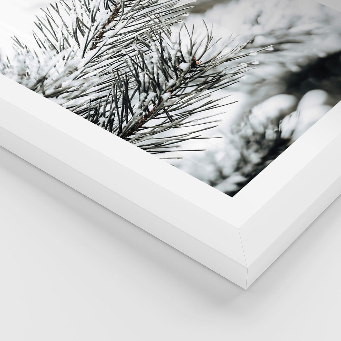 Plakat w ramie 50x70 - Chwila Zimowej Magii - iglasta gałązka, śnieg - rama biała
