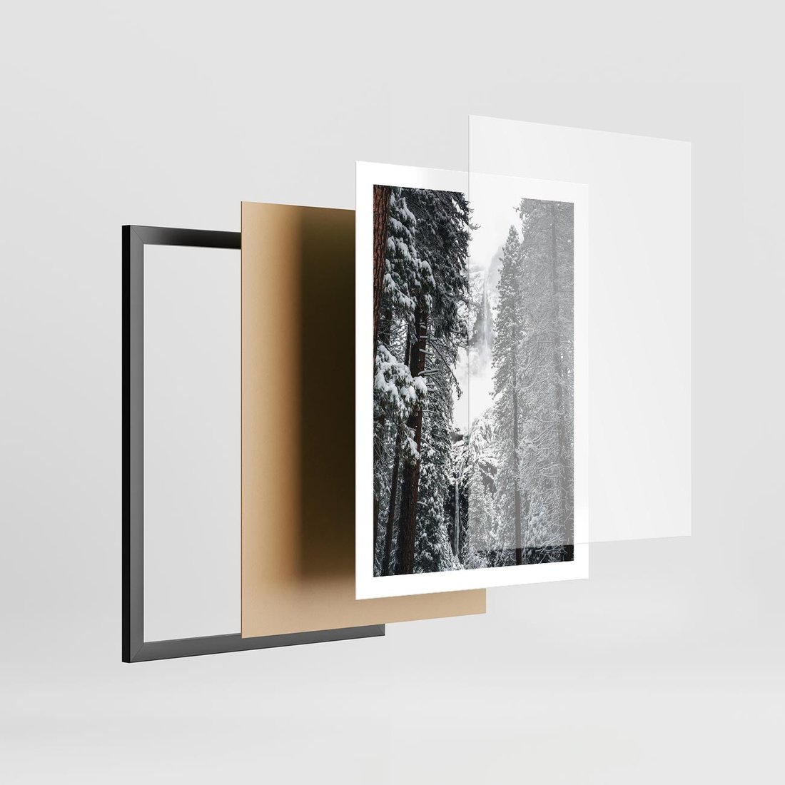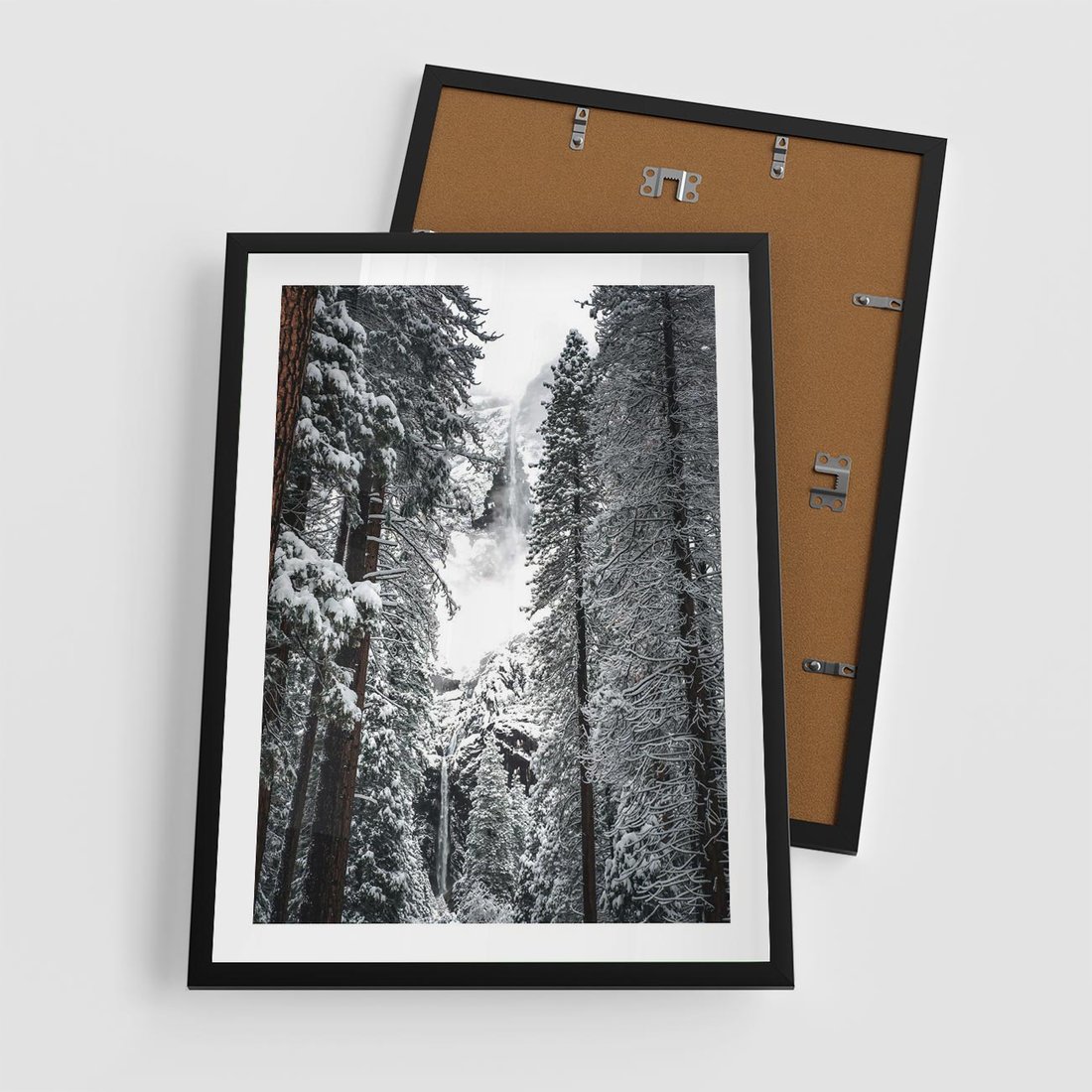 Plakat w ramie 50x70 - Cicha Magia Zimowego Lasu - zimowy las, ośnieżone drzewa - rama czarna