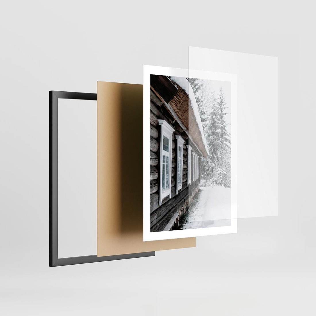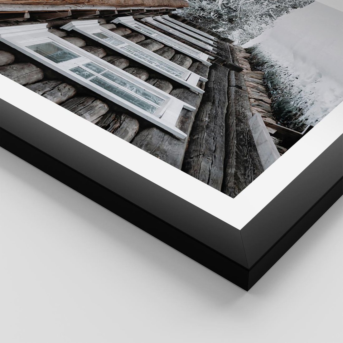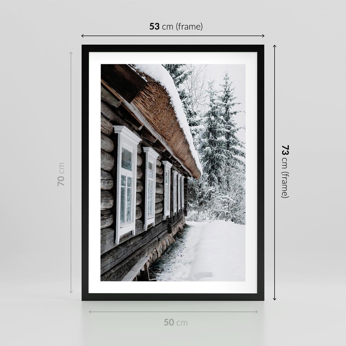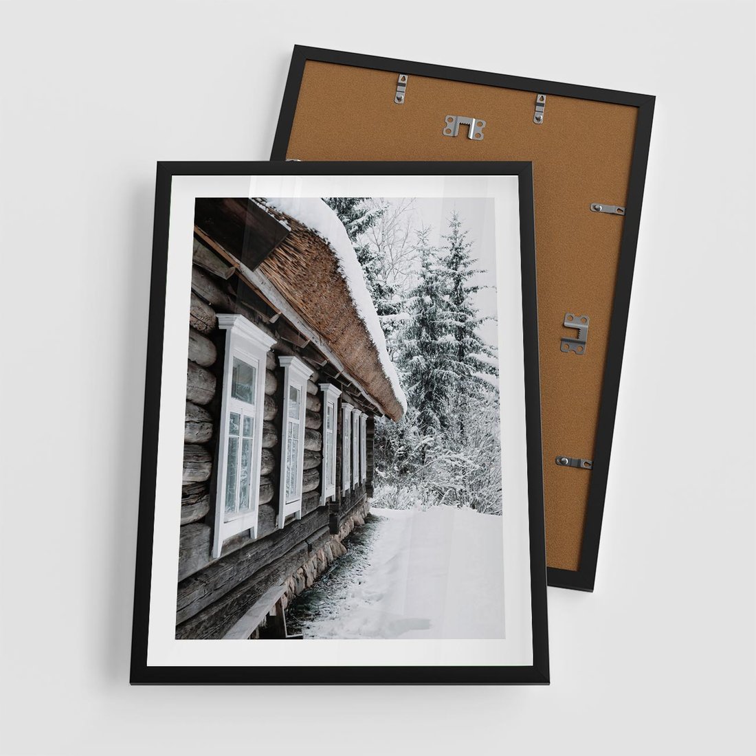 Plakat w ramie 50x70 - Cicha Zima - zima, domek w górach - rama czarna