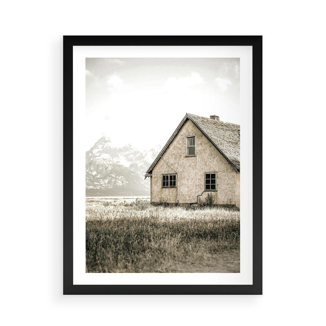 Obraz przedstawia stary dom w górach utrzymany w odcieniach sepii, co nadaje mu nostalgiczny i urokliwy wygląd.