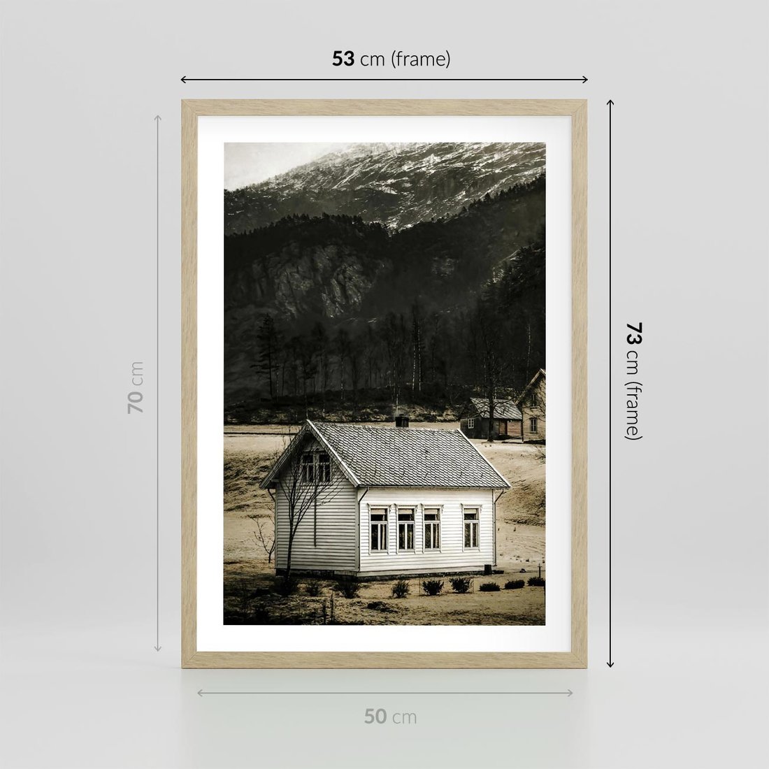 Plakat w ramie 50x70 - Ciepło i Urok Górskiego Domku - domek w górach, sepia - rama drewno