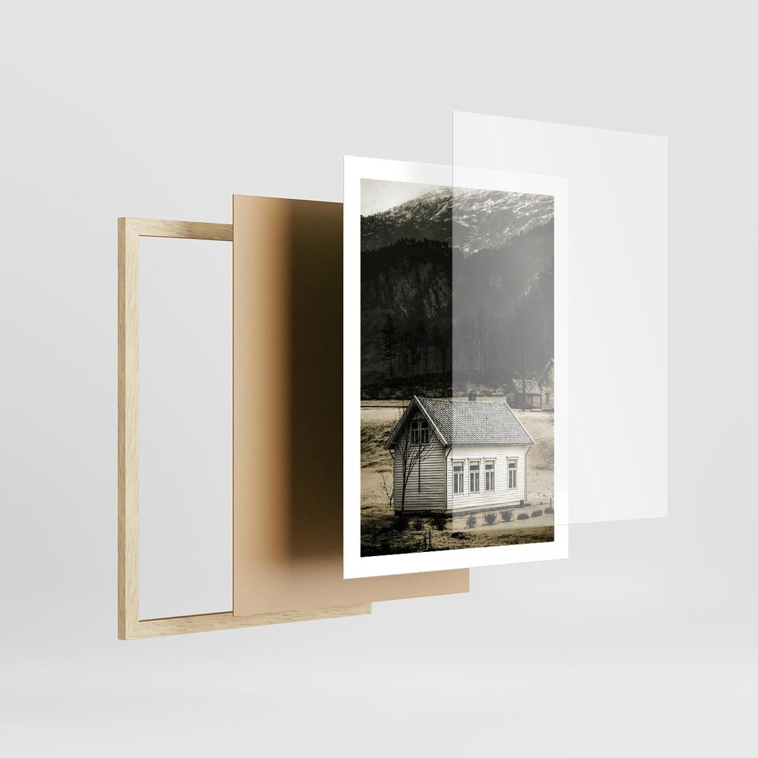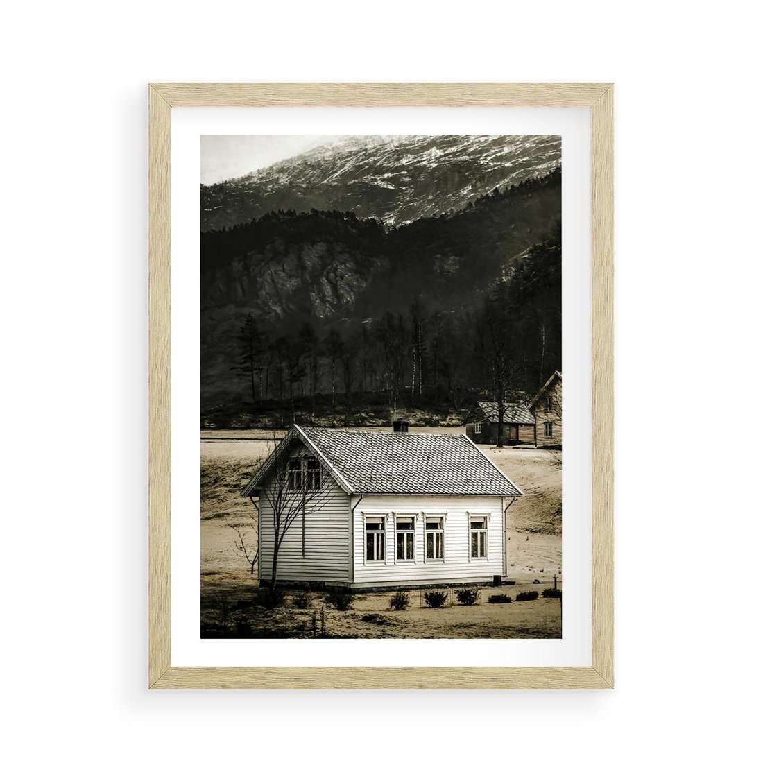 Obraz przedstawia domek w górach utrzymany w odcieniach sepii. Ta kompozycja nadaje wnętrzom klasyczną i nostalgiczna atmosferę.