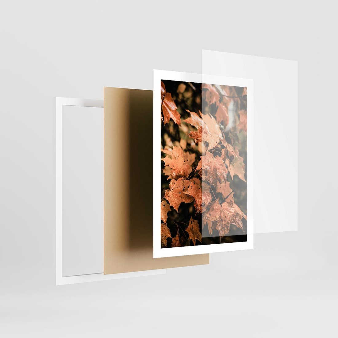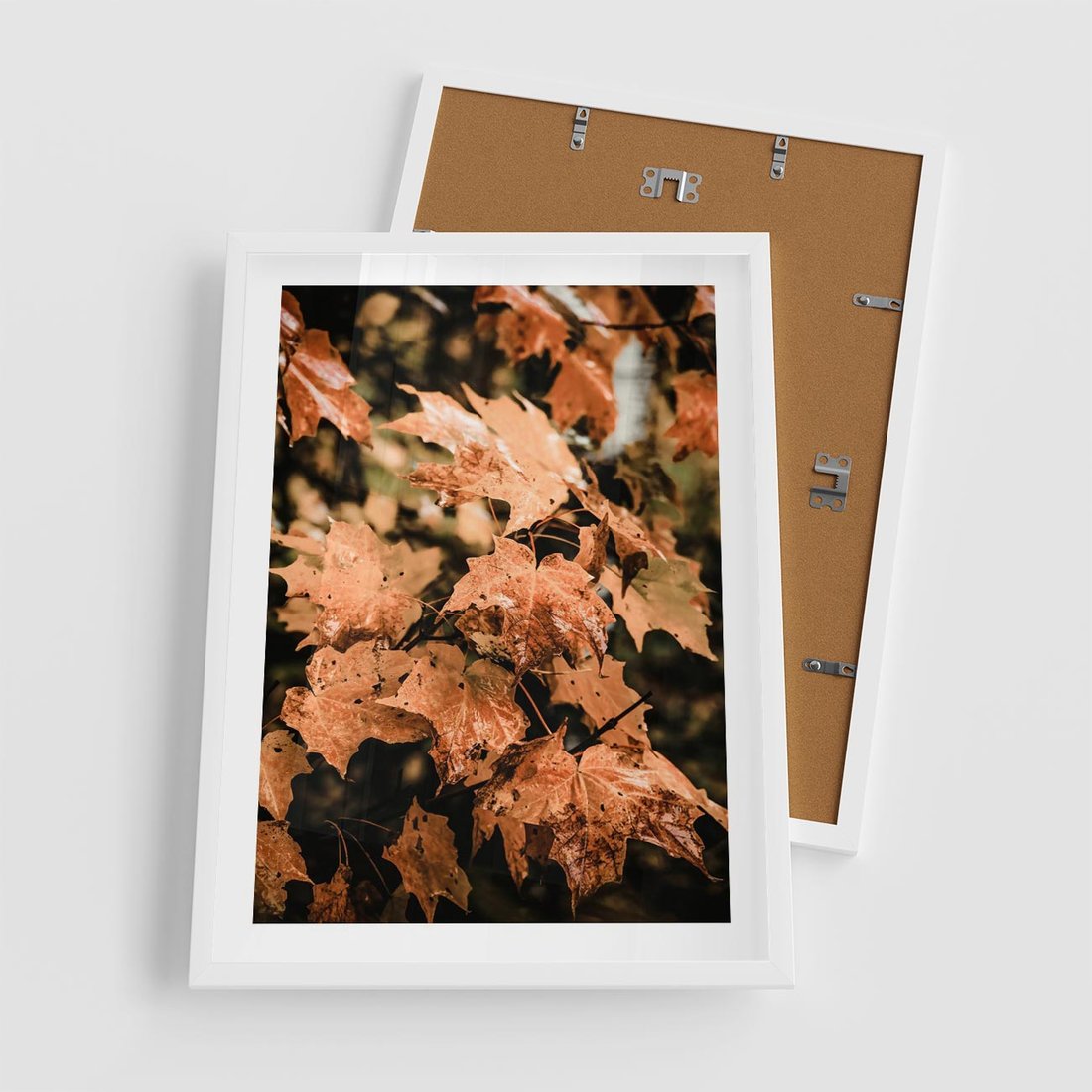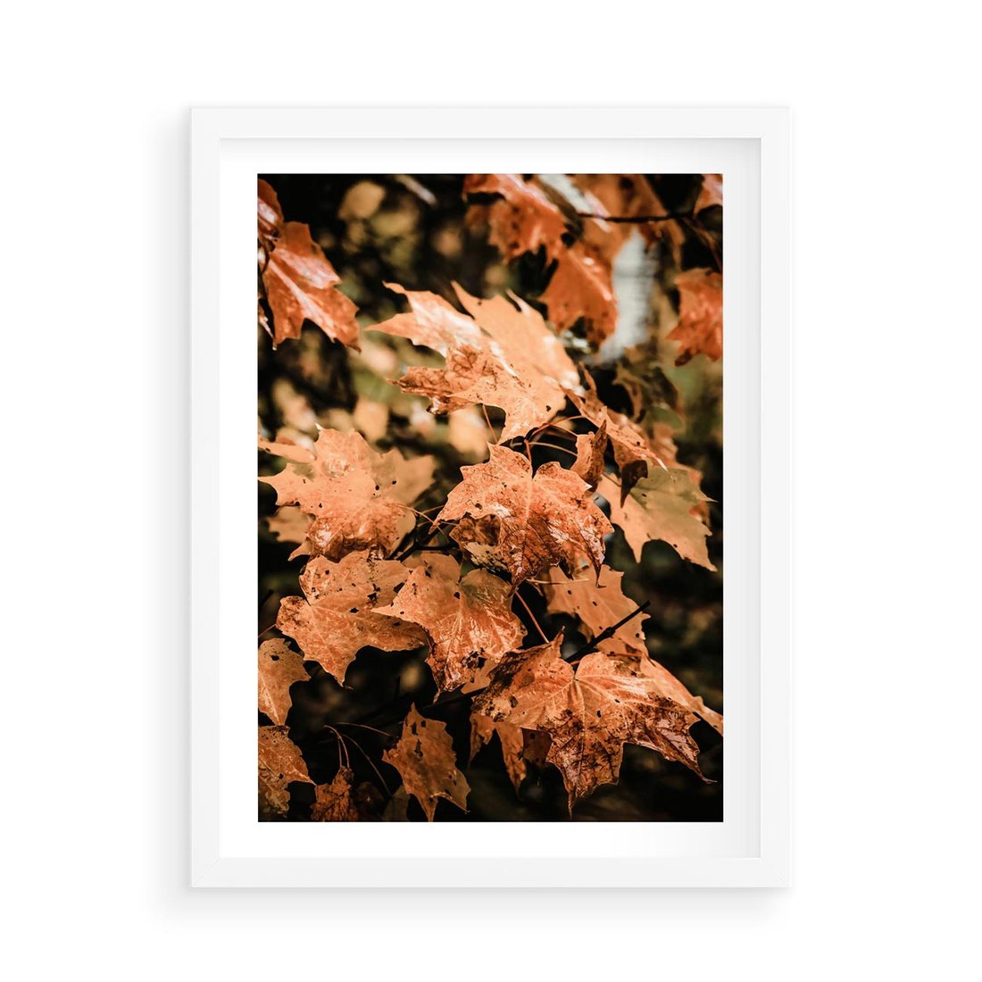 Plakat w ramie 50x70 - Ciepło Jesieni - jesienne pomarańczowe liśćie, jesień - rama biała