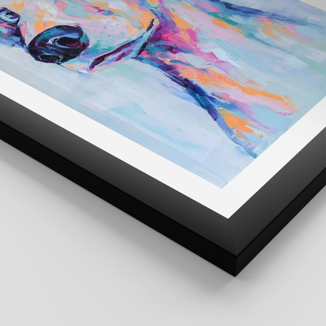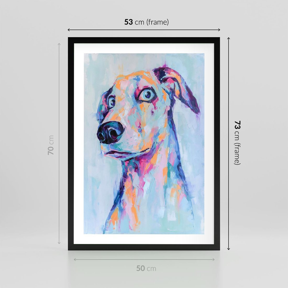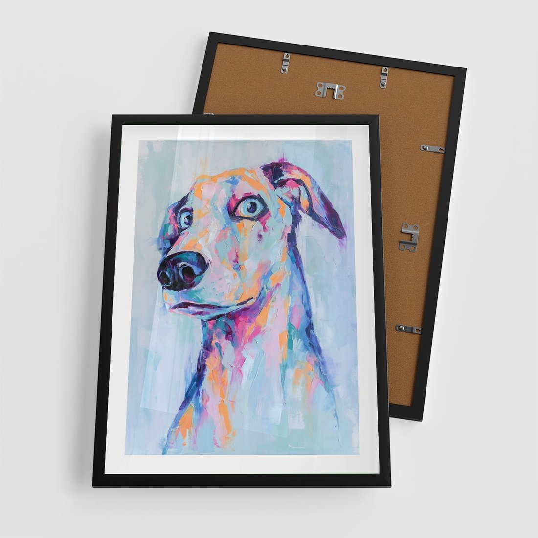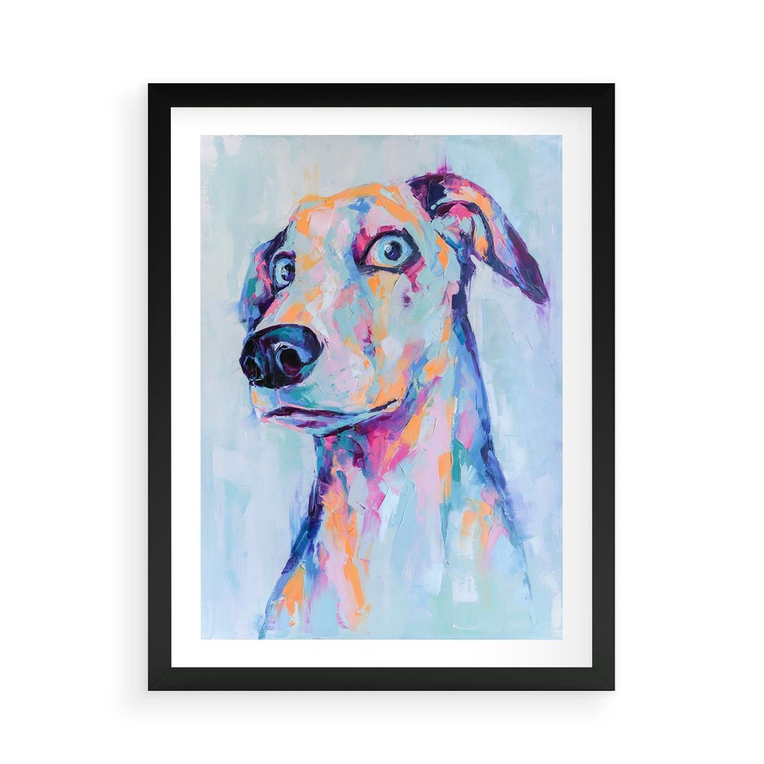 Ten olejny obraz to nie tylko portret psa, ale także zabawna i nowoczesna sztuka, która wykorzystuje pastelowe kolory, aby przekazać radość i humor. W centrum obrazu znajduje się portret uroczego psa. Pastelowe kolory nadają obrazowi lekkości i przyjemności. To dzieło sztuki doskonale pasuje do wnętrz, gdzie doceniane są zarówno nowoczesność, jak i poczucie humoru, a także jest znakomitą dekoracją dla miłośników psów.