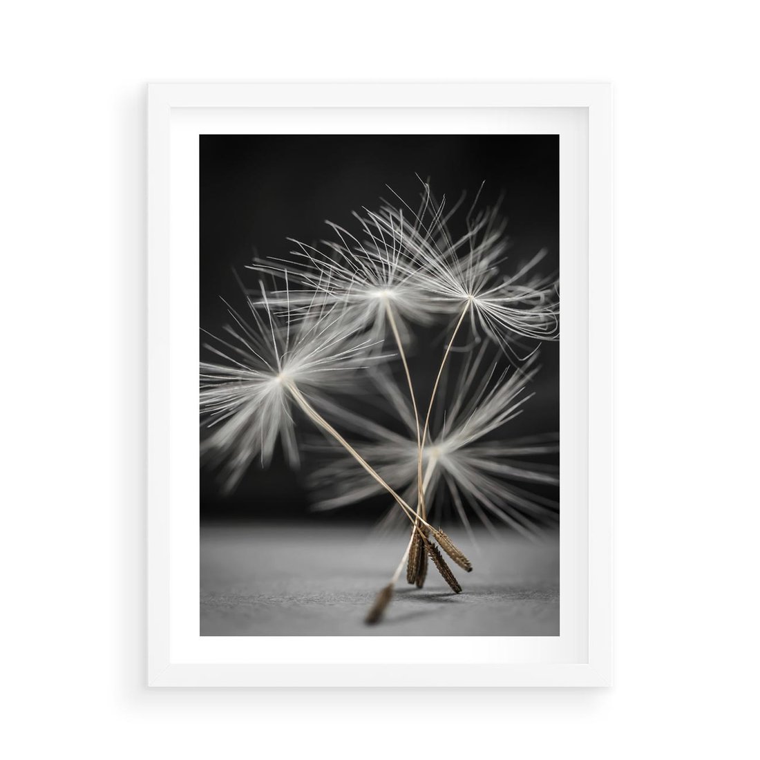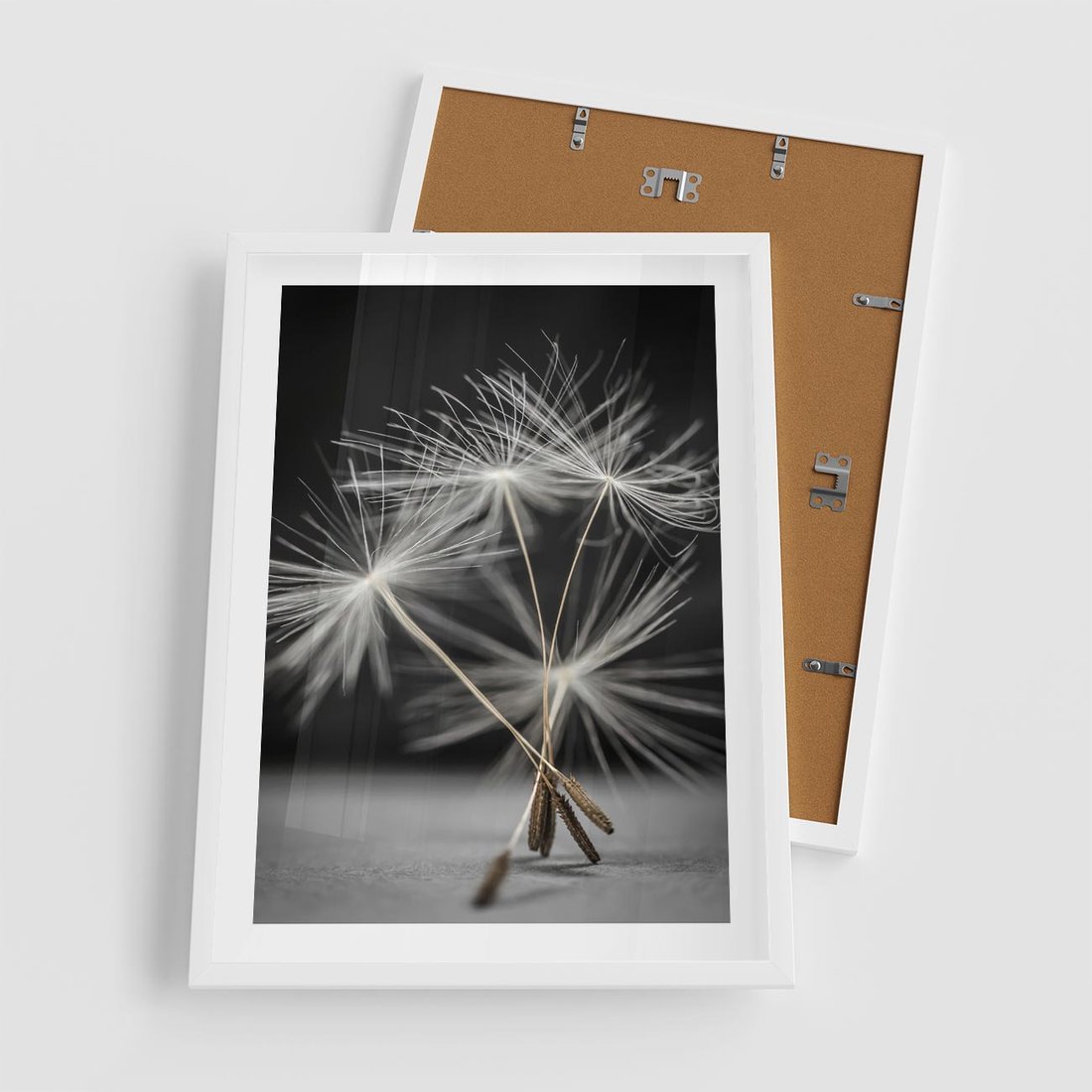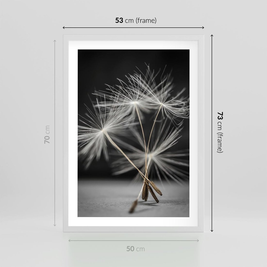 Plakat w ramie 50x70 - Delikatność dmuchawców zbliżenie - dmuchawce, zbliżenie - rama biała
