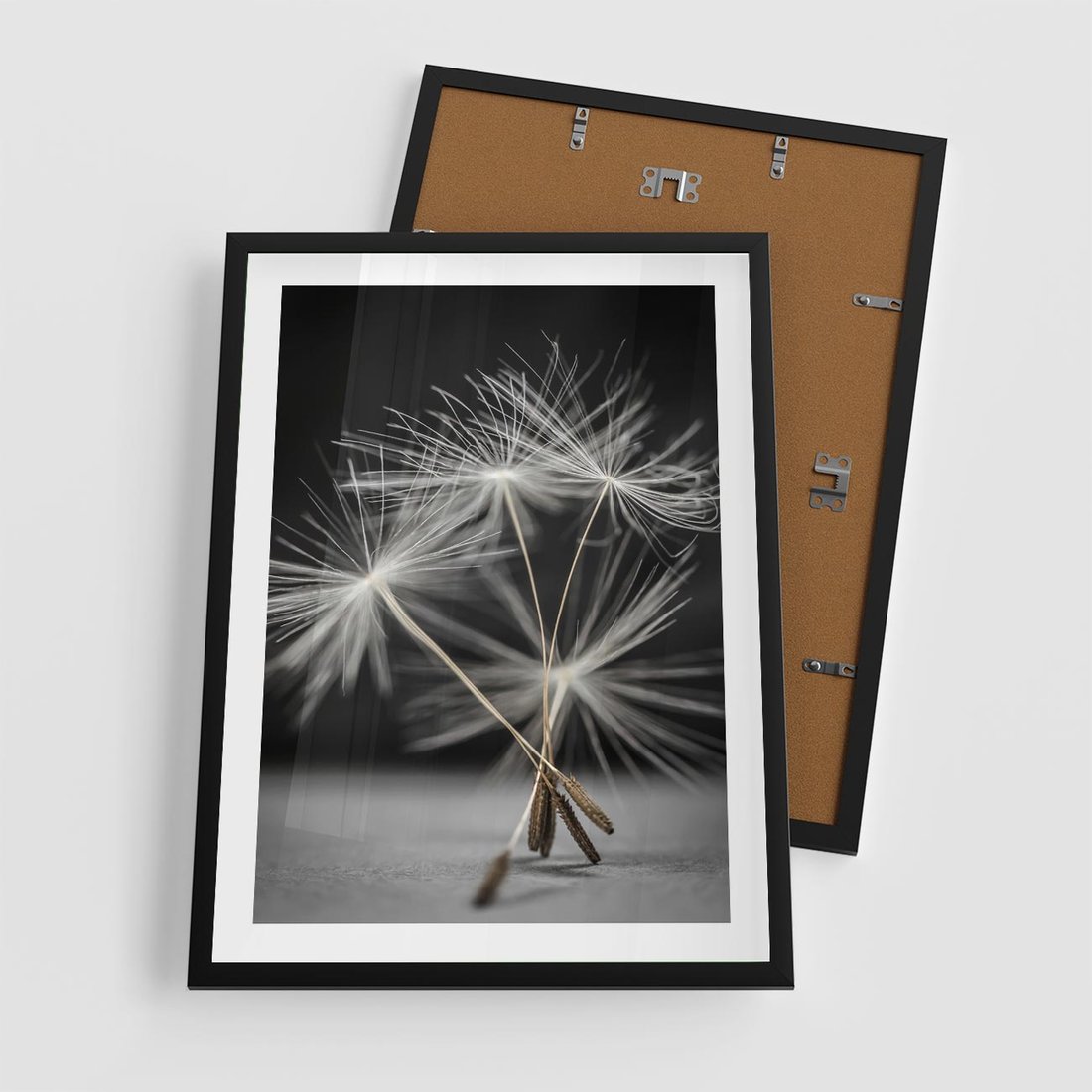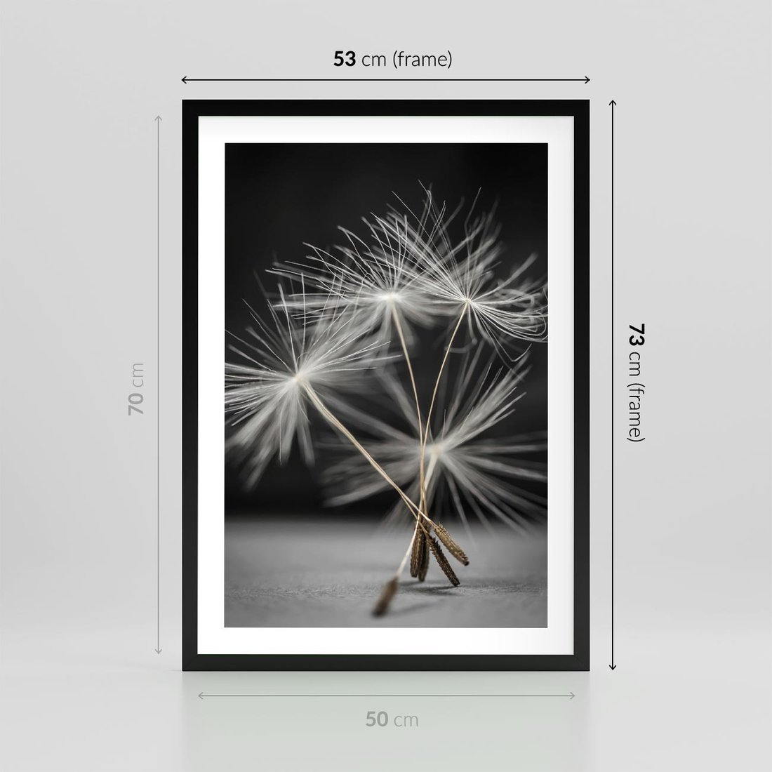 Plakat w ramie 50x70 - Delikatność dmuchawców zbliżenie - dmuchawce, zbliżenie - rama czarna