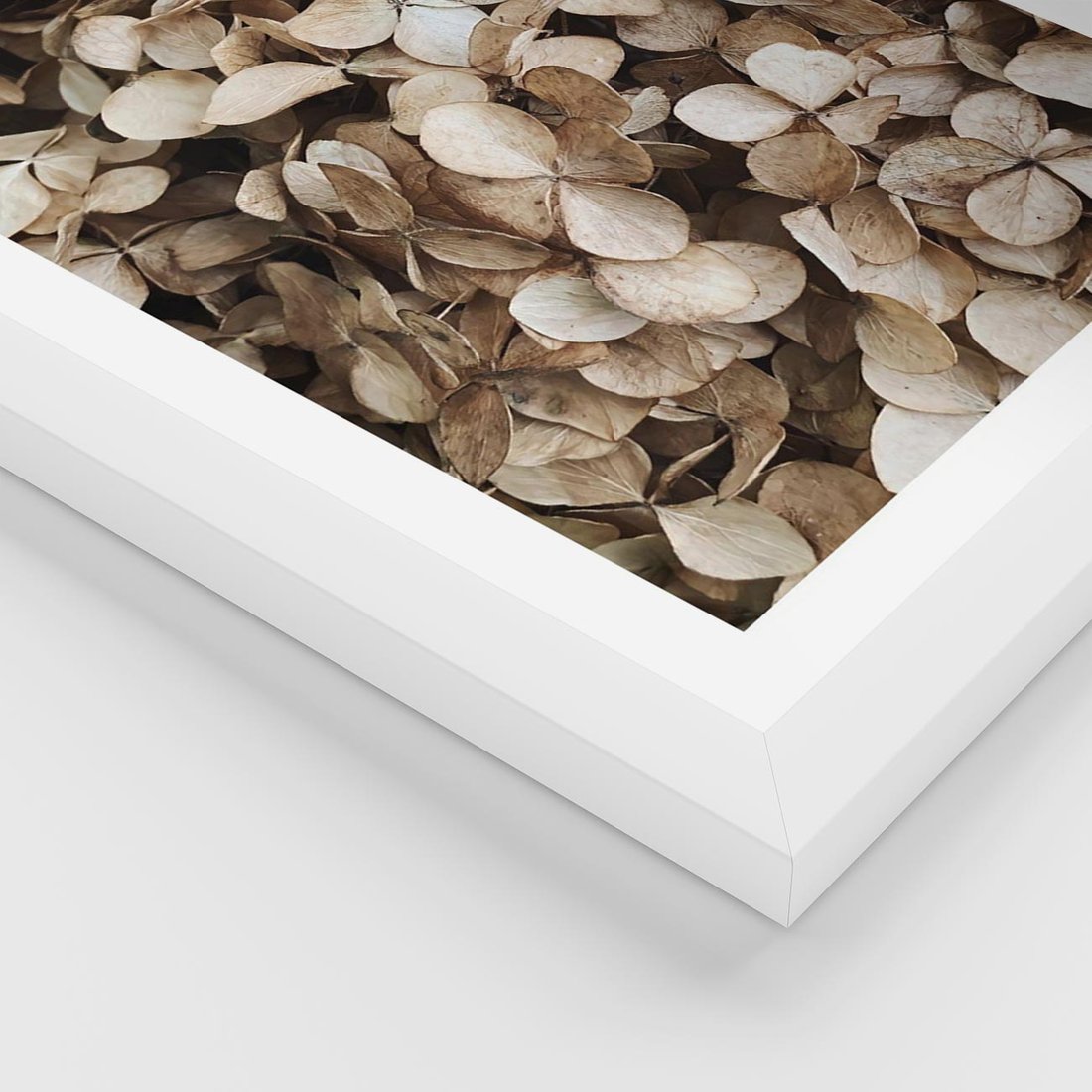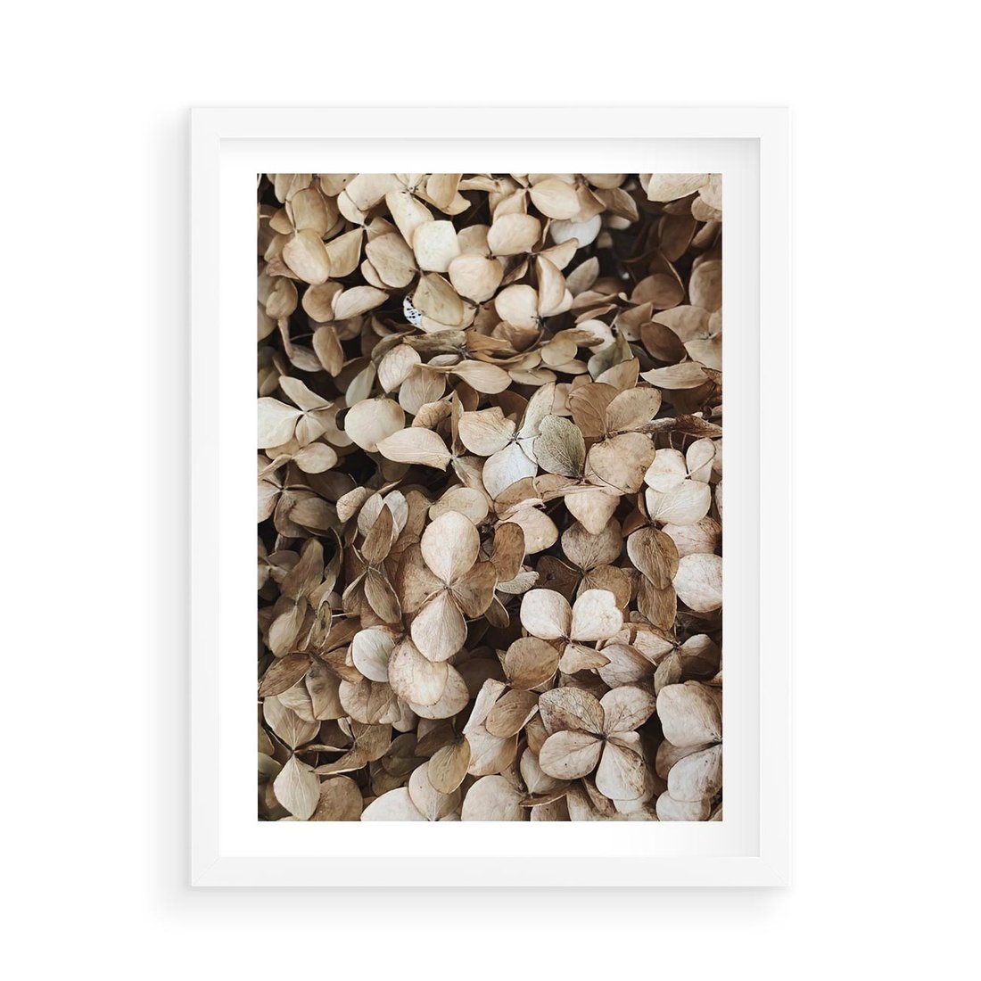 Plakat w ramie 50x70 - Delikatność Hortensji: Kompozycja Kwiatów w Beżu - hortensja, odcienie beżu - rama biała