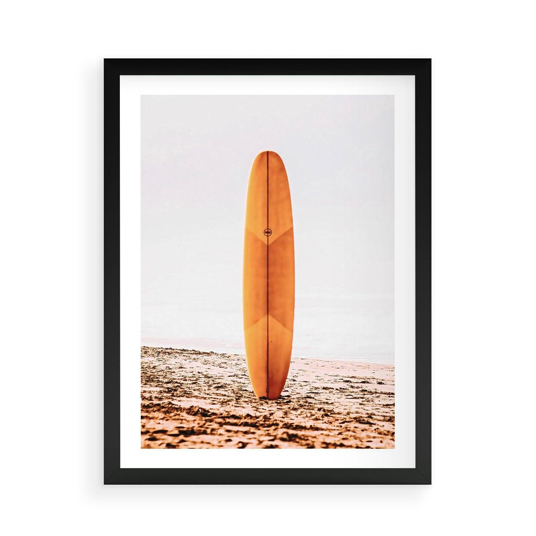 Plakat w ramie 50x70 - Deska w Piasku: Gotowa na Fale - plaża, pomarańczowa deska surfingowa wbita w piasek - rama czarna