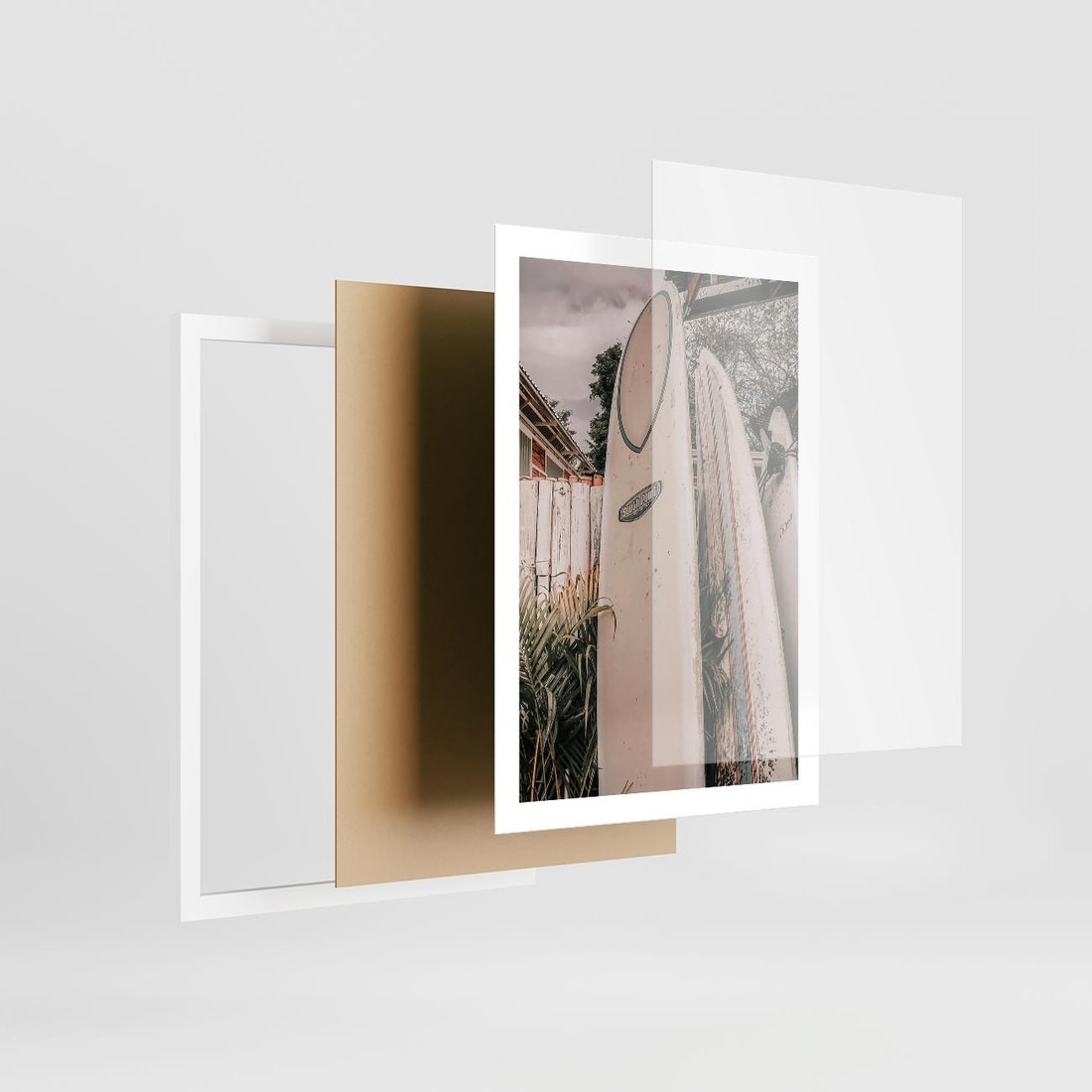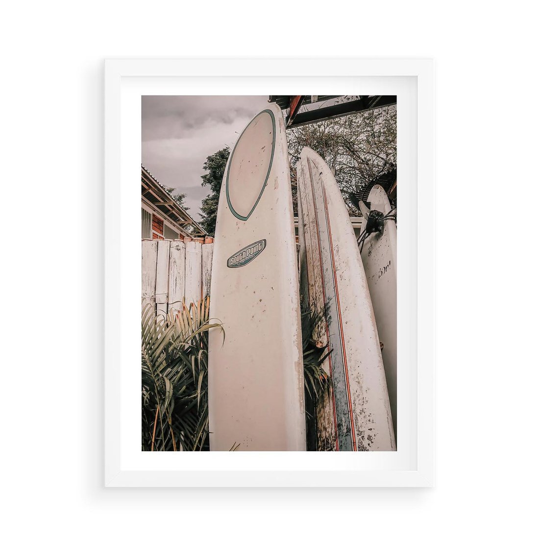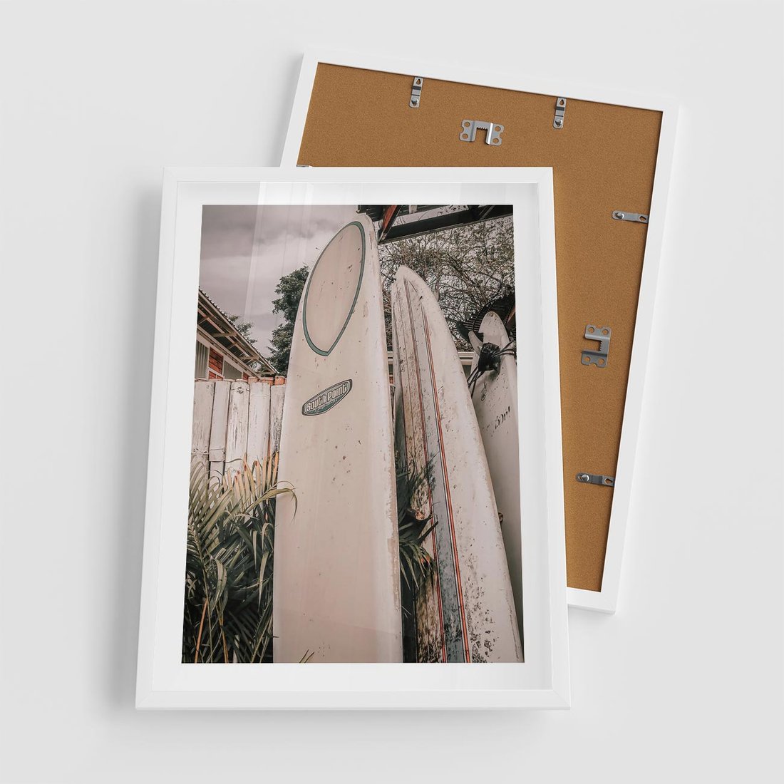 Plakat w ramie 50x70 - Deski Surfingowe czekają na Fale - deski surfingowe, stoją pod płotem - rama biała