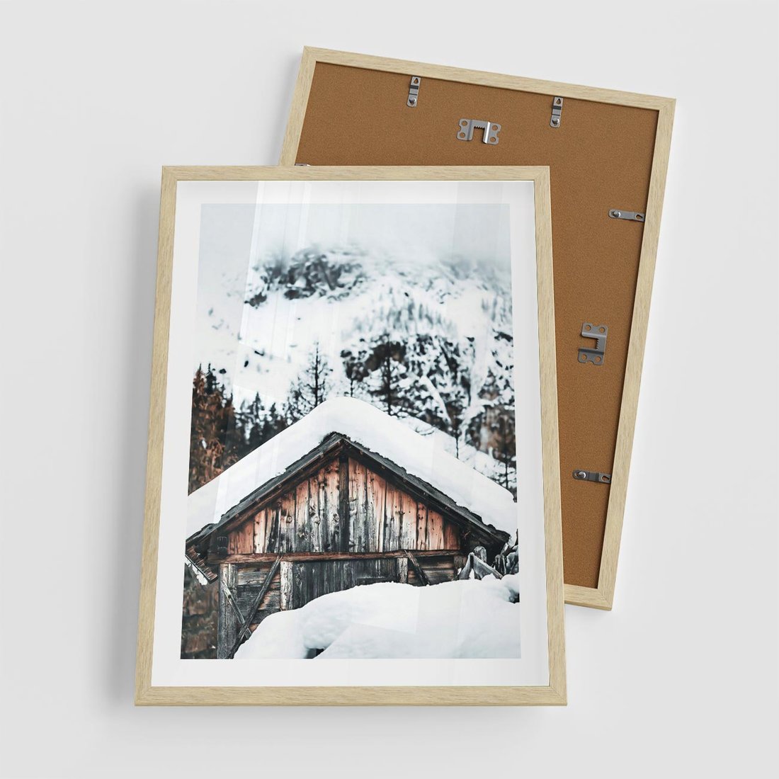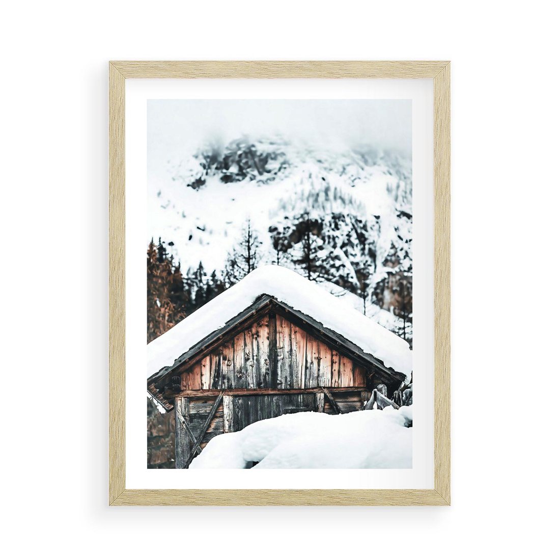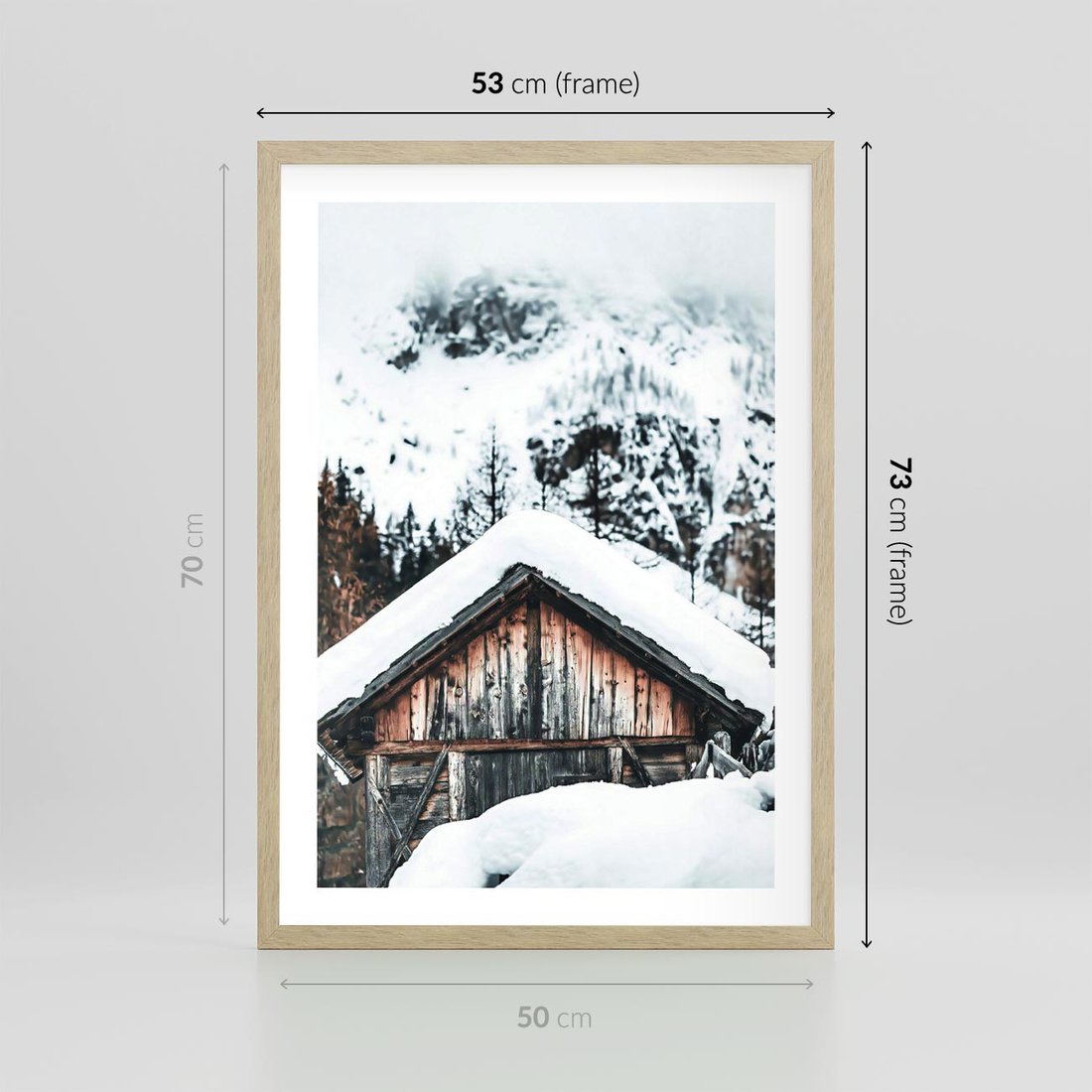 Plakat w ramie 50x70 - Domek w Górach w Białym Odcieniu - zima, domek w górach - rama drewno