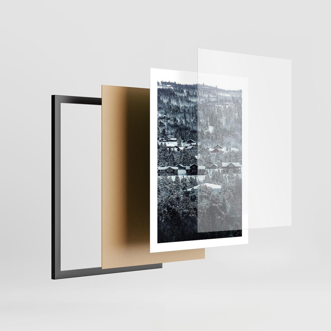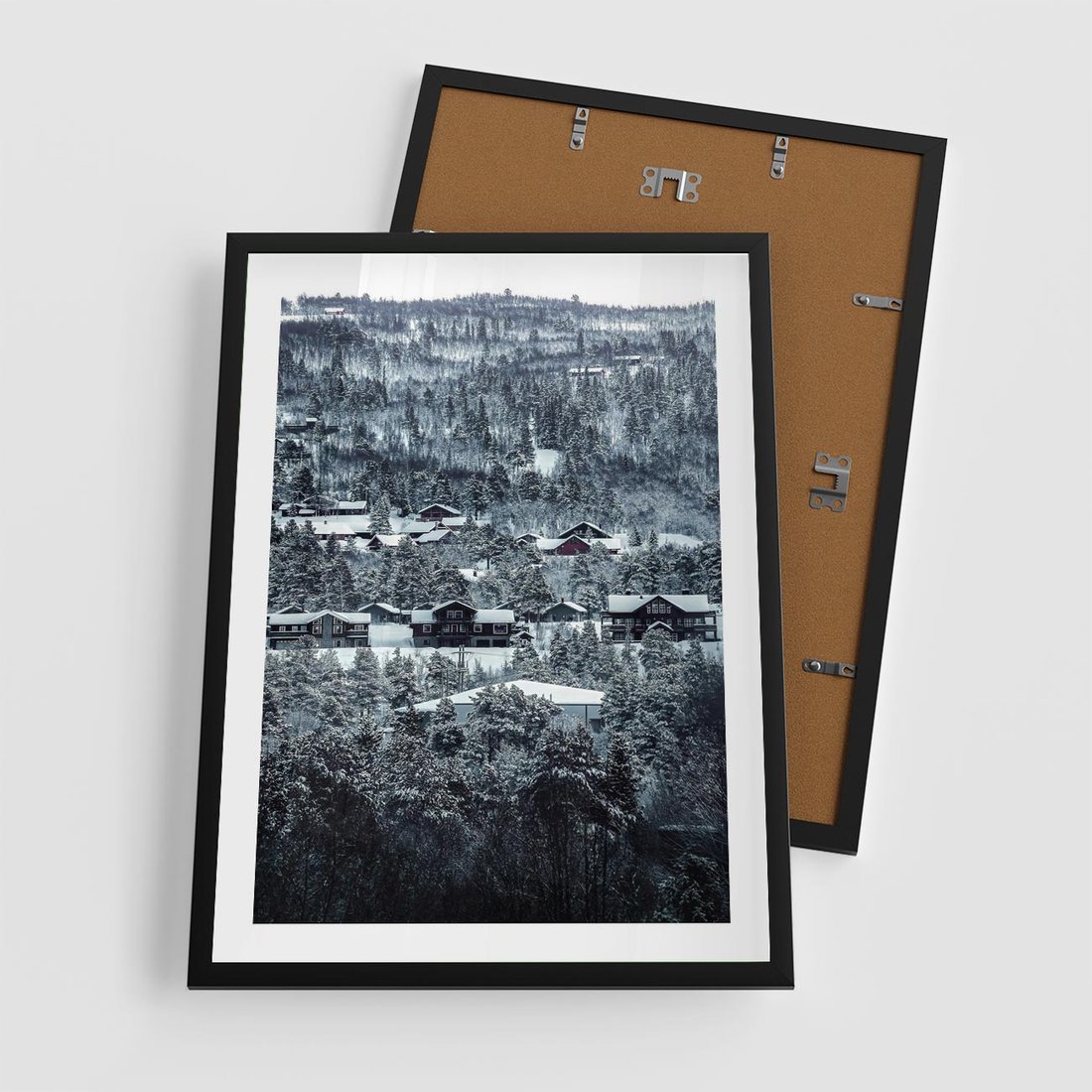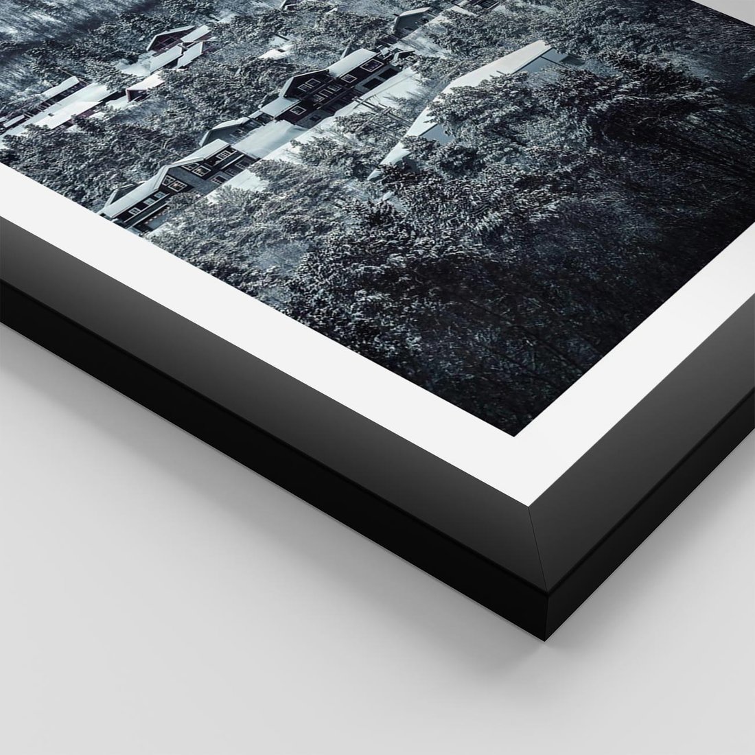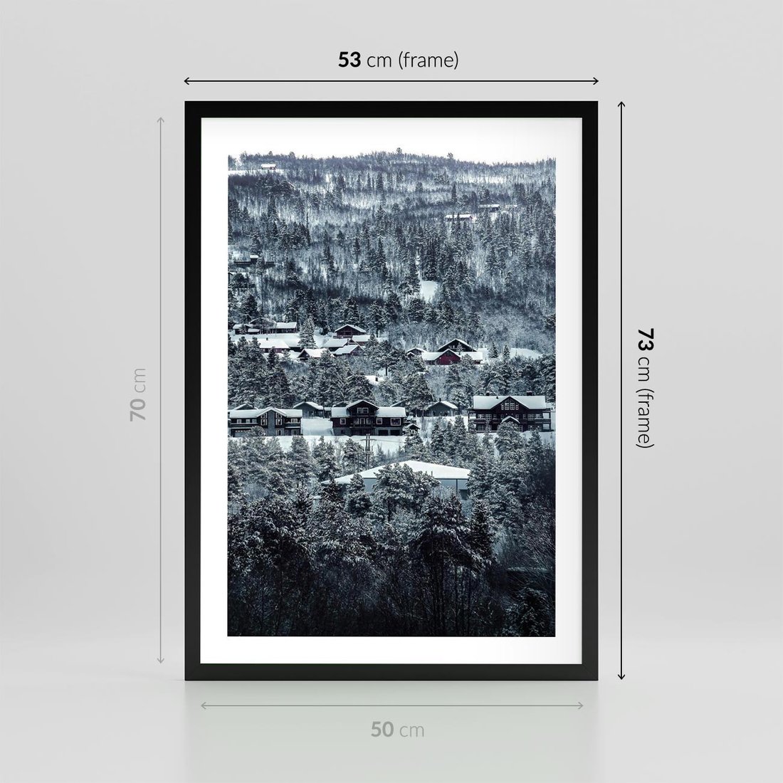 Plakat w ramie 50x70 - Domki w Chmurach - górski zimowy krajobraz, dommki na wzgórzach - rama czarna