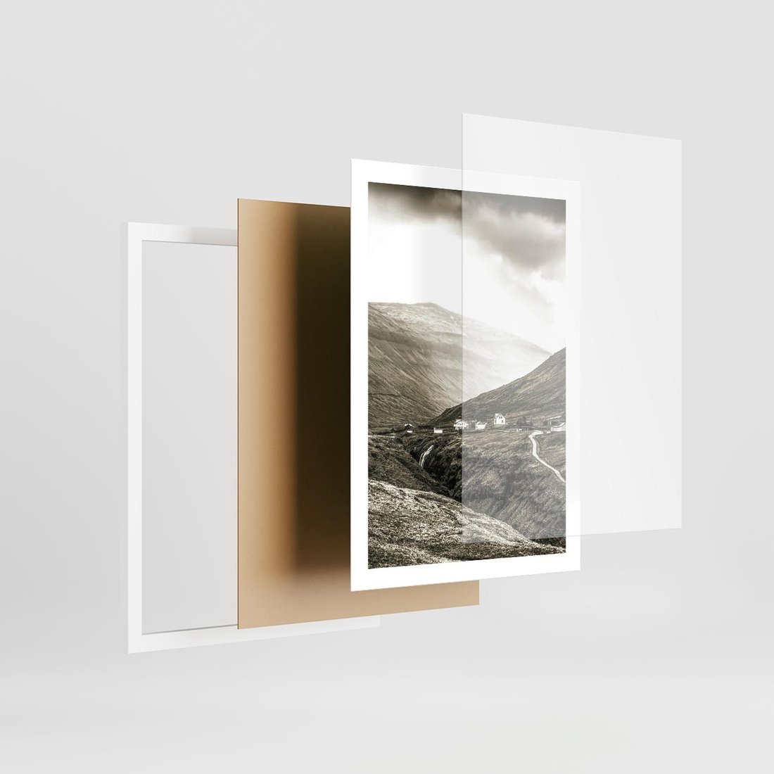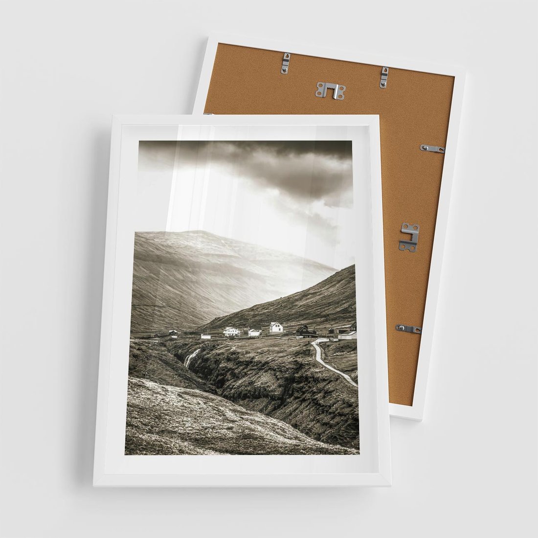 Plakat w ramie 50x70 - Domki w Górach - czarno biała fotografia, górski pejzaż - rama biała