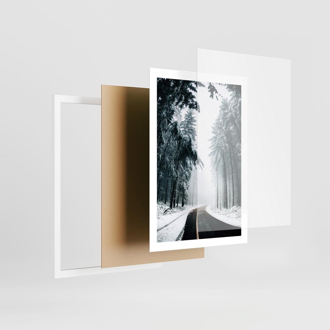 Plakat w ramie 50x70 - Droga przez Zimowy Las - drzewa, śnieg - rama biała