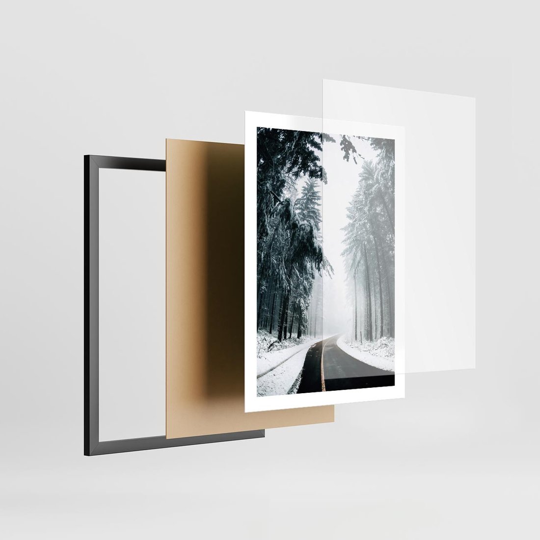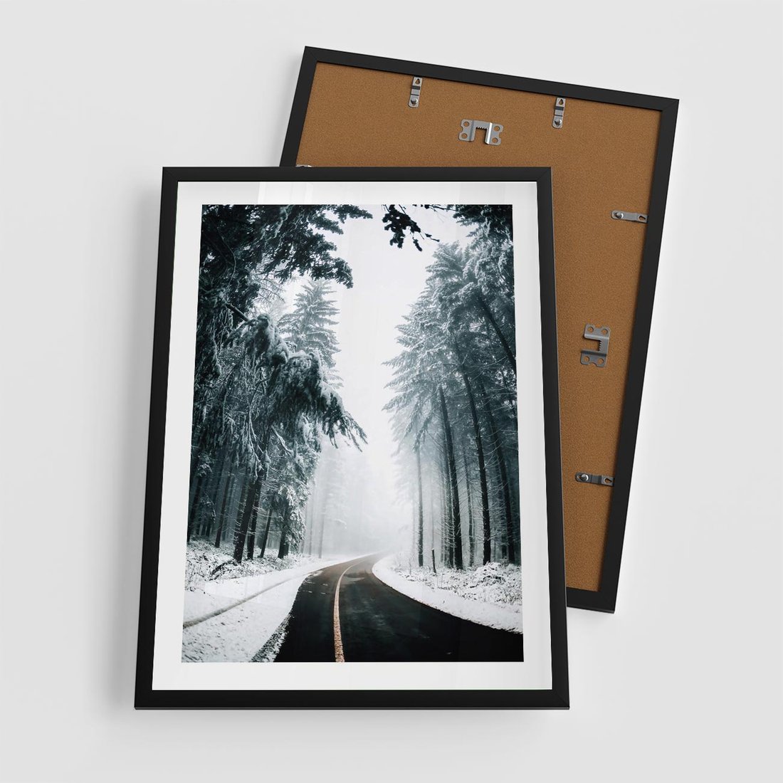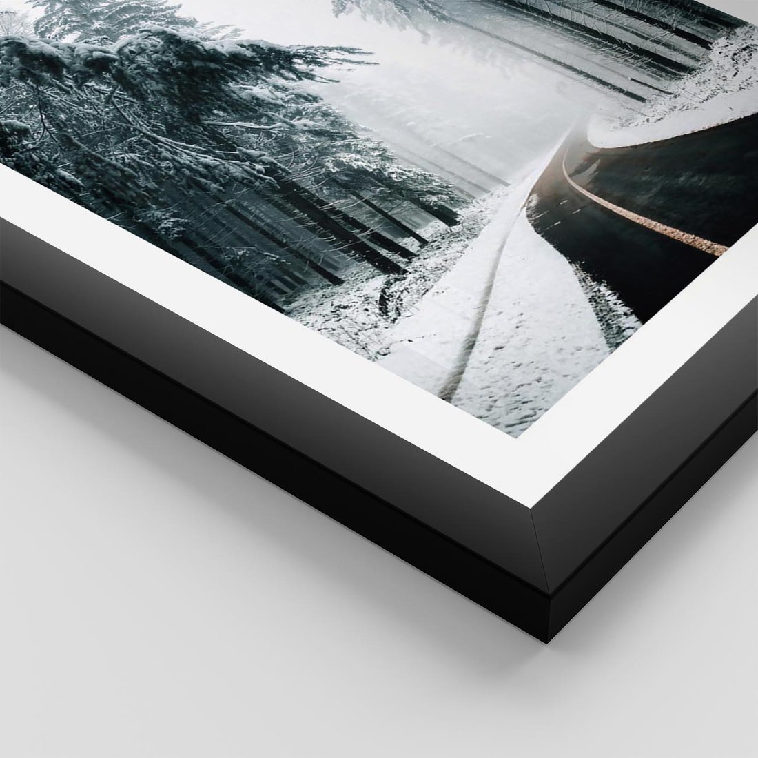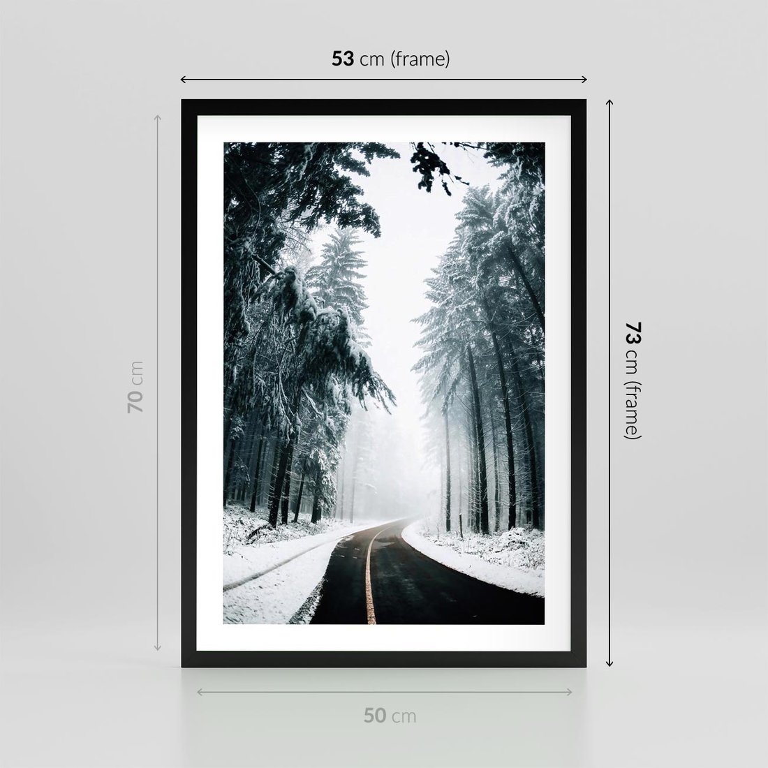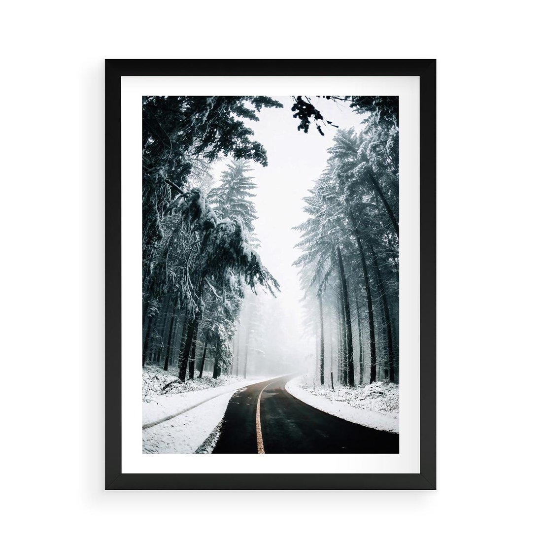 Plakat w ramie 50x70 - Droga przez Zimowy Las - drzewa, śnieg - rama czarna