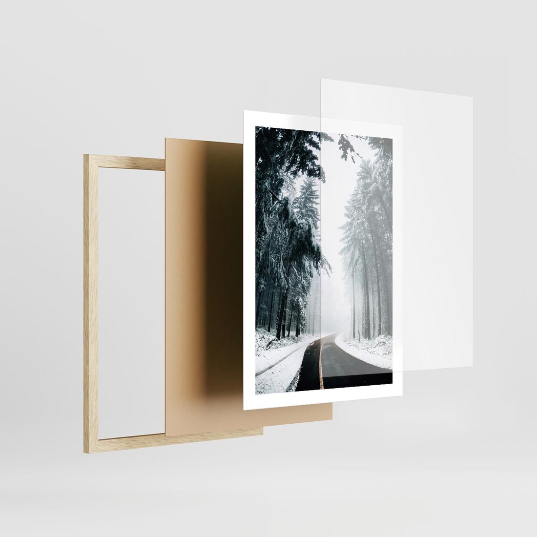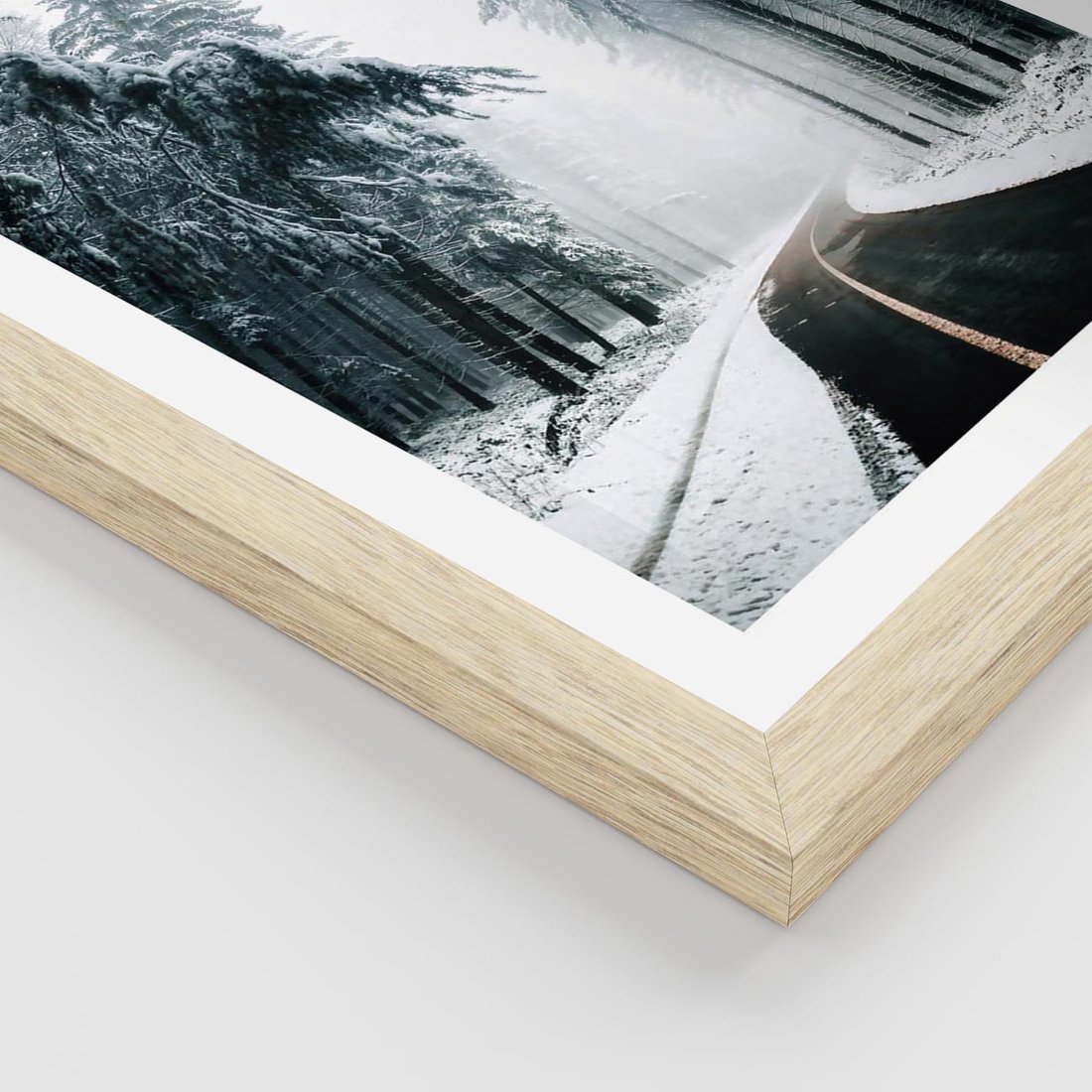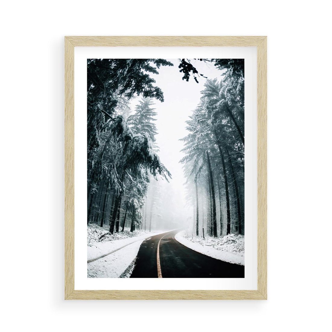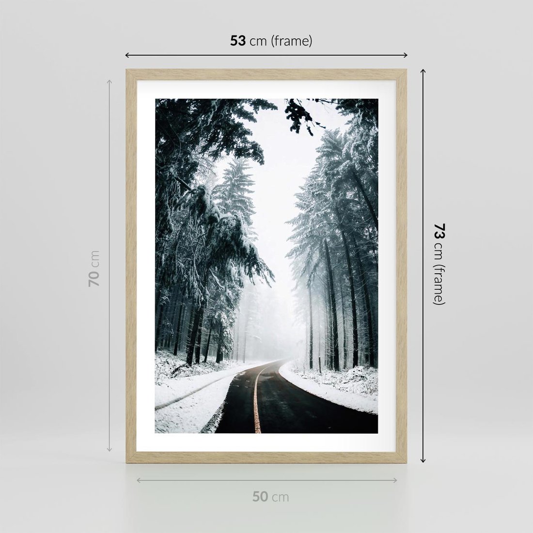 Plakat w ramie 50x70 - Droga przez Zimowy Las - drzewa, śnieg - rama drewno