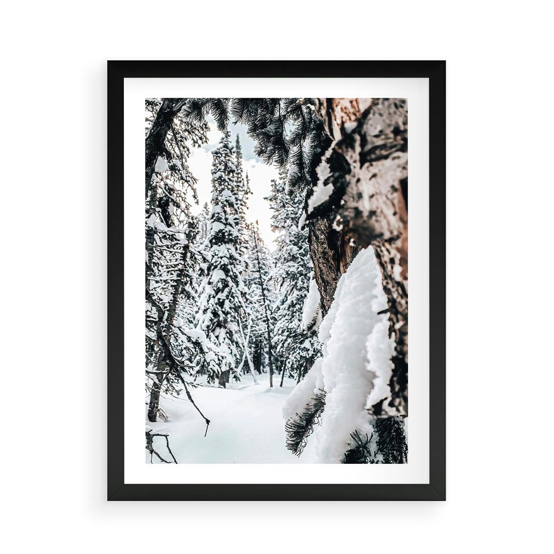 To ujęcie zimowego lasu, gdzie drzewa pokryte są warstwą śniegu, tworząc malowniczy i spokojny krajobraz zimowy. Obraz doskonale pasuje do wnętrz utrzymanych w stylu skandynawskim lub rustykalnym, nadając im atmosferę spokoju i uroku natury.