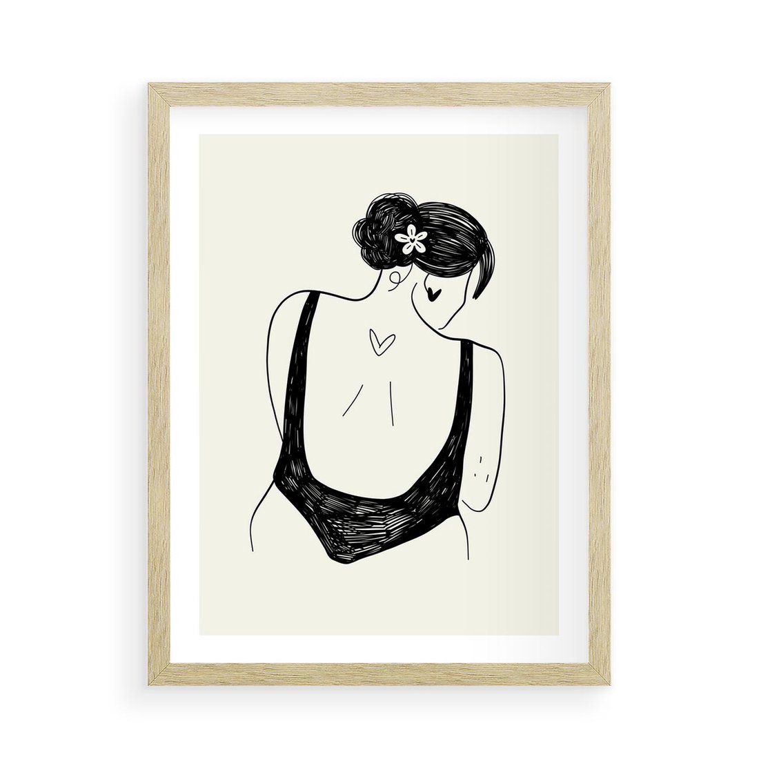 Ten nowoczesny rysunek uchwycił esencję piękna kobiecego ciała, prezentując delikatną harmonię między kobietą a sztuką w formie wyjątkowej kompozycji.