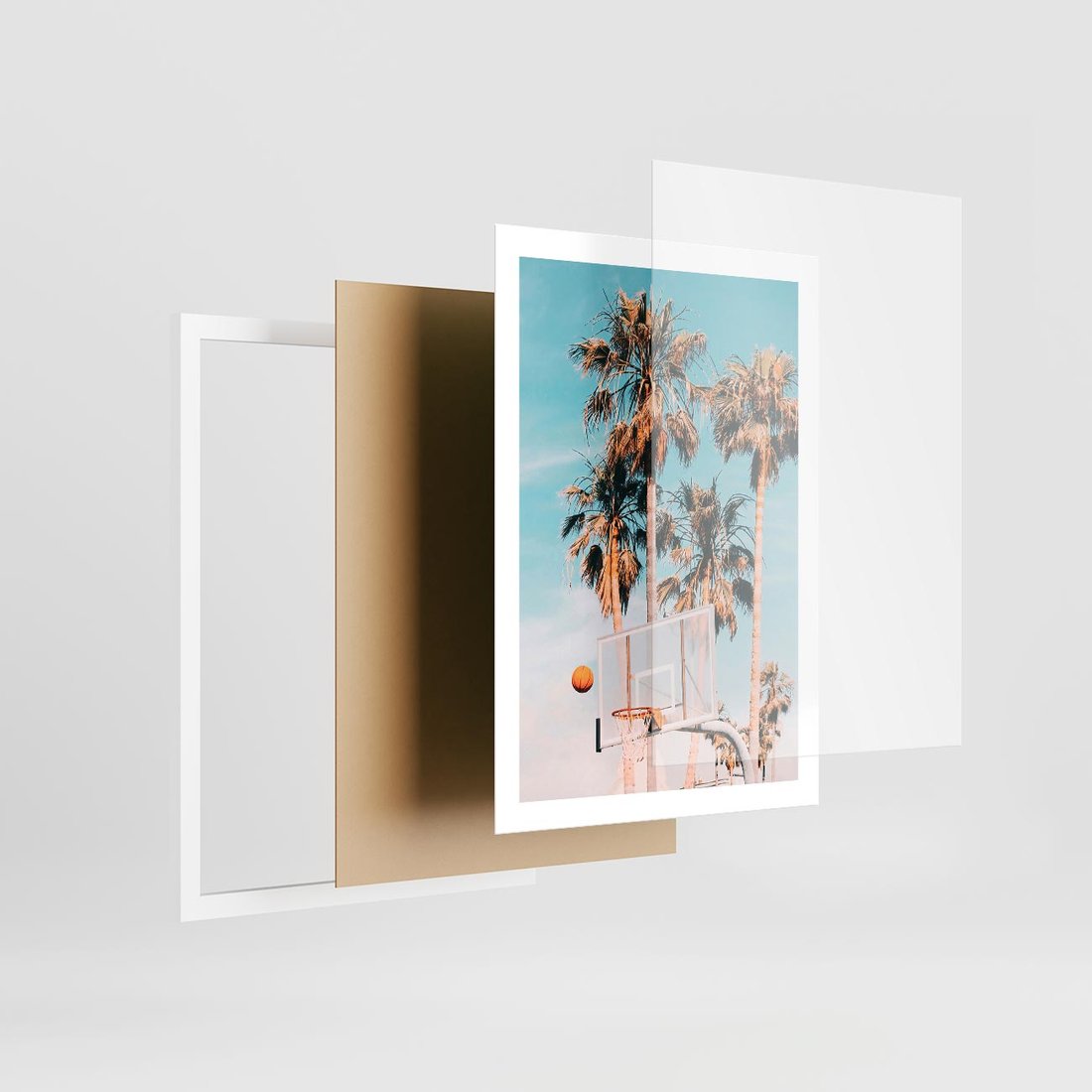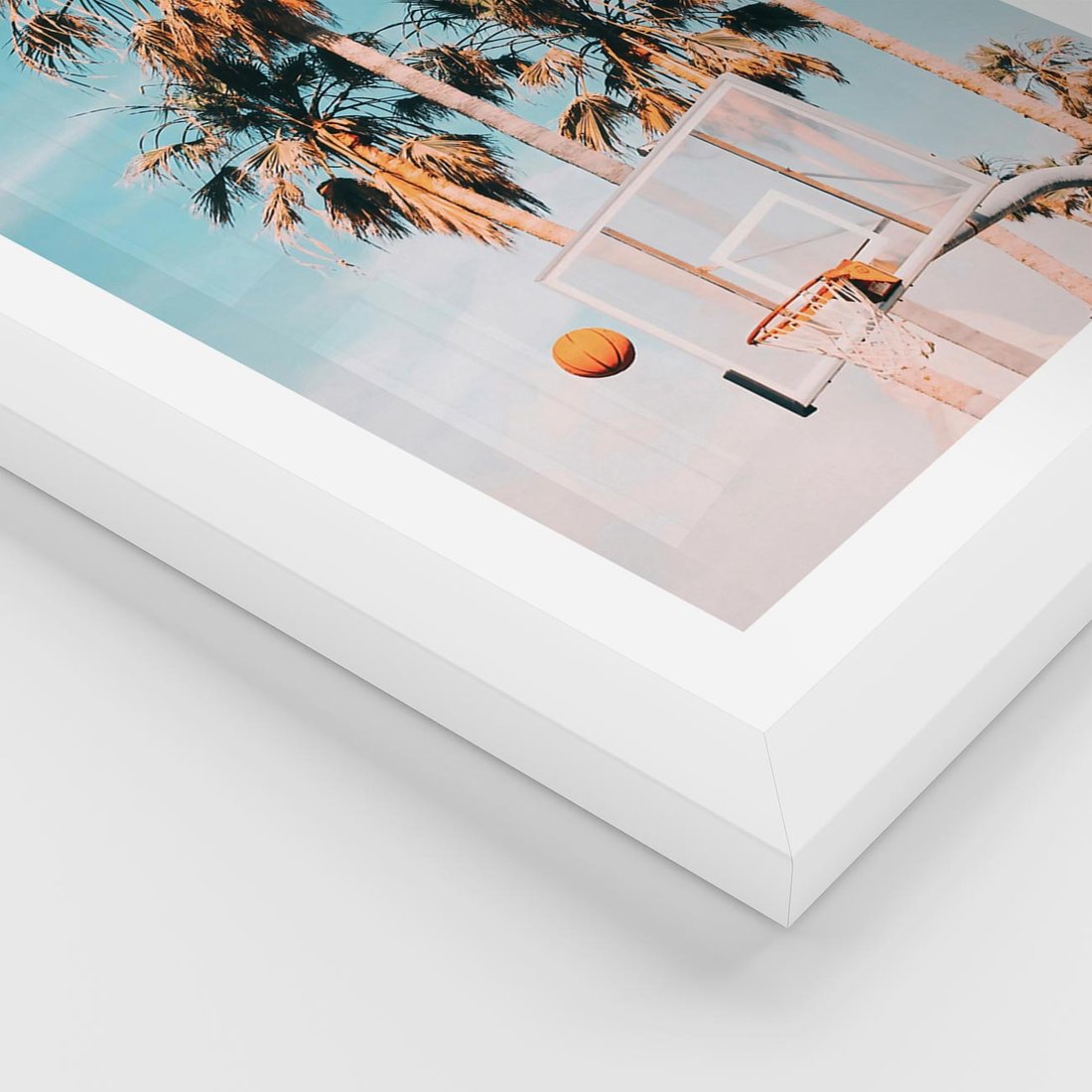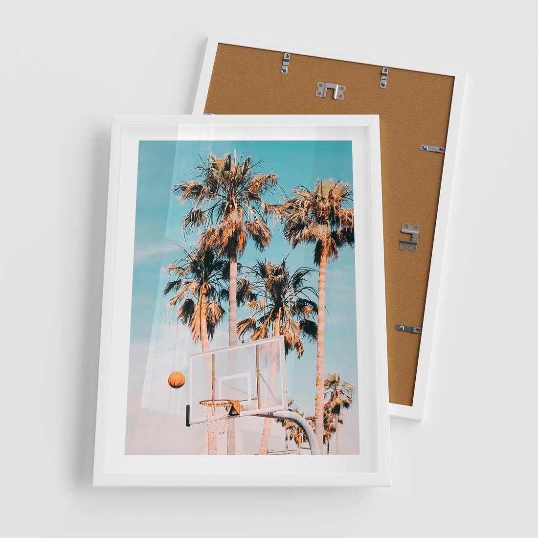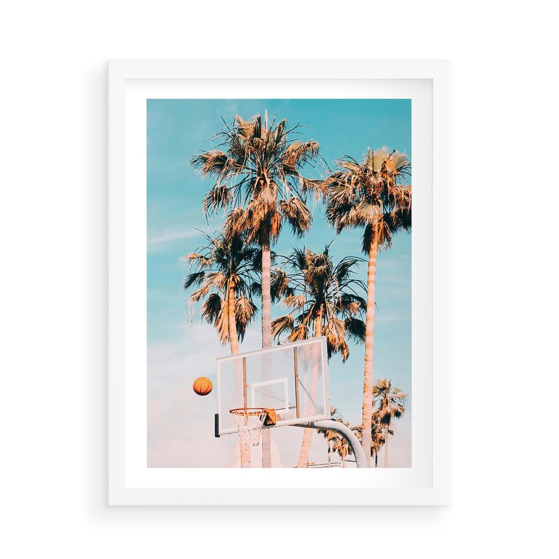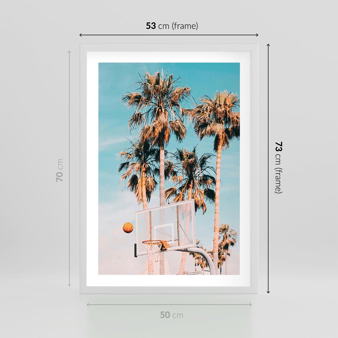 Plakat w ramie 50x70 - Egzotyczna Koszykówka - palmy na tle nieba, koszykówka - rama biała