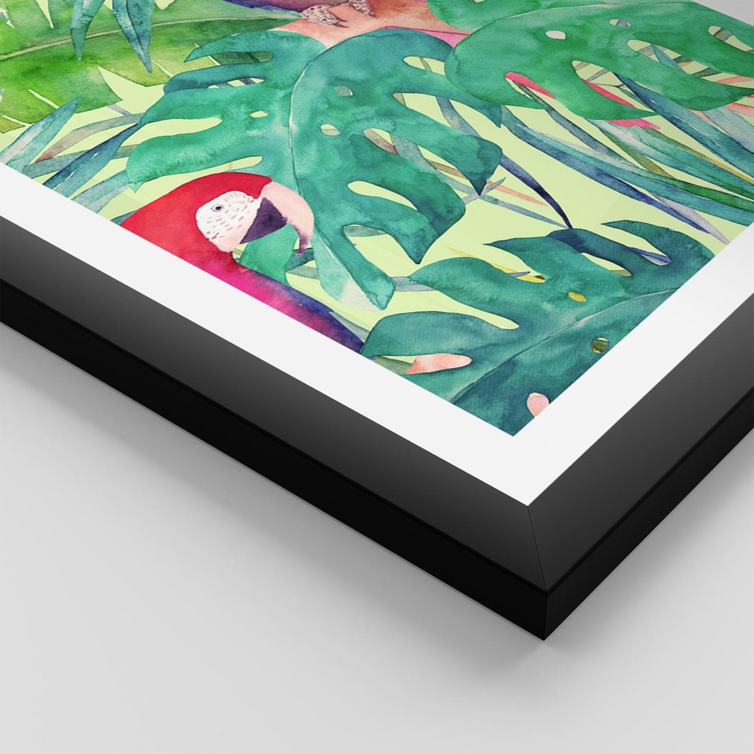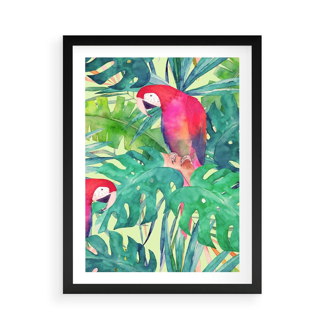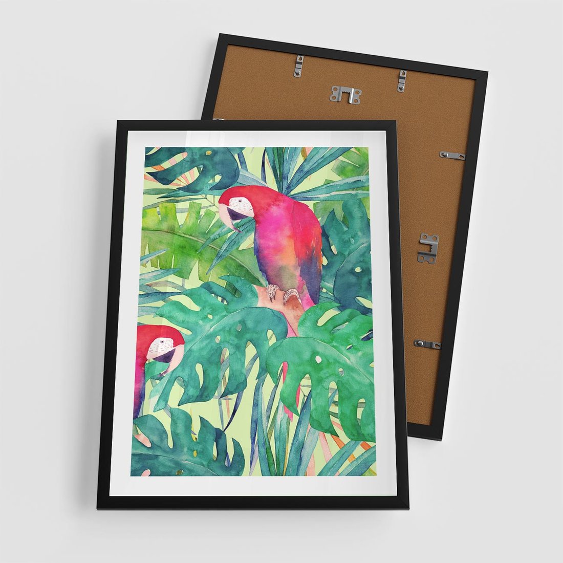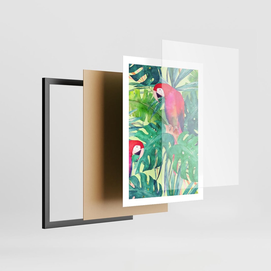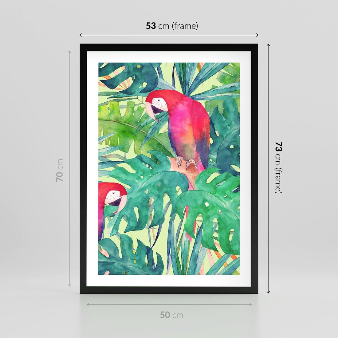 Ta egzotyczna kompozycja przedstawiająca tropikalne liście i papugi wprowadzi do Twojego wnętrza atmosferę egzotycznej przygody i kolorowego świata natury. Odkryj bogactwo kształtów i intensywność barw. Dodaj tropikalnego uroku i wyrazistości do swojego wnętrza.
