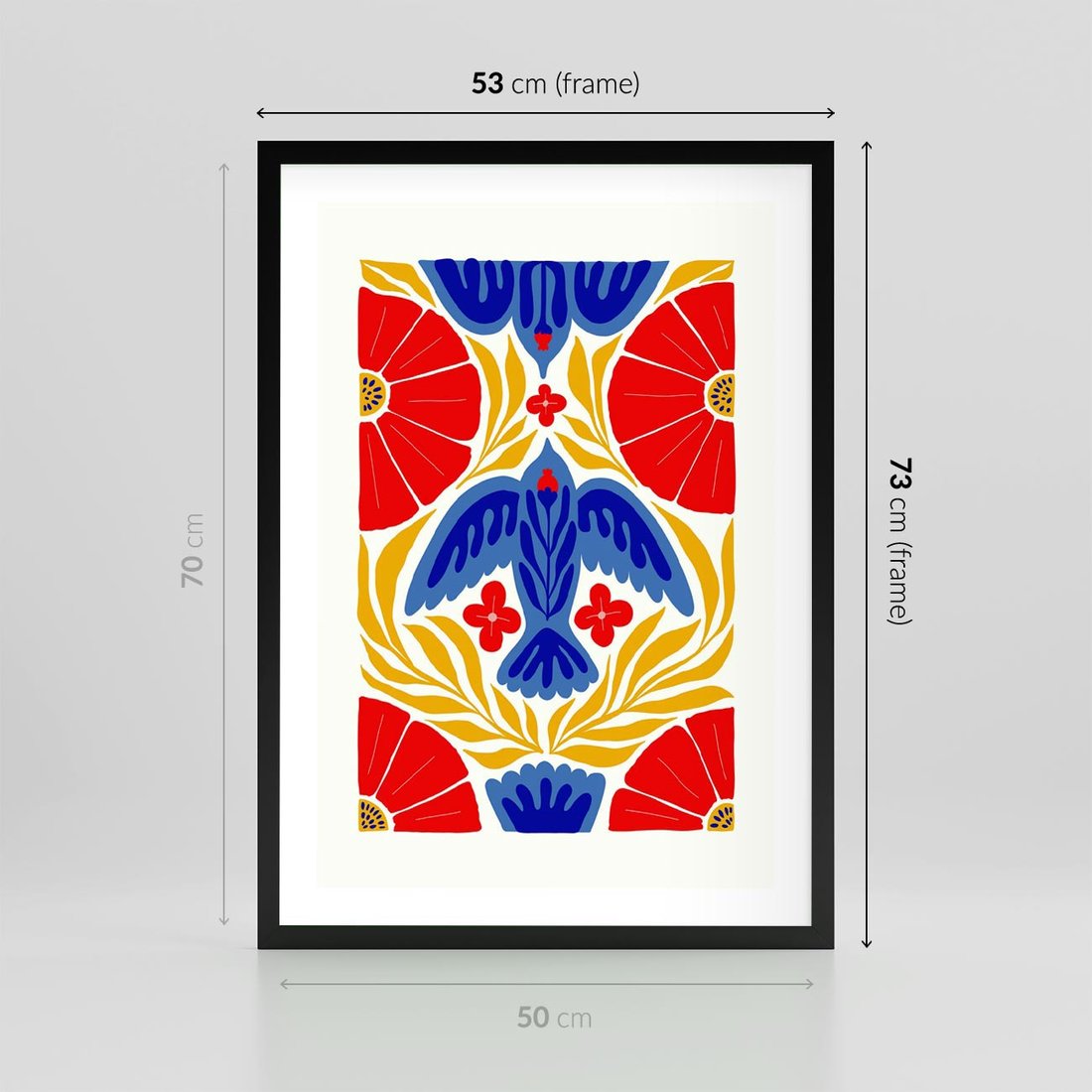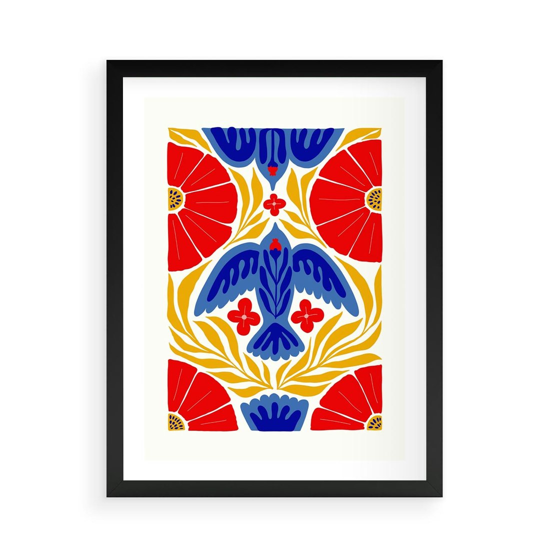 Wyrazista grafika ożywa mocnymi barwami czerwieni, niebieskiego i żółtego. Centralny ptak otoczony czerwonymi kwiatami tworzy dynamiczną kompozycję, która przyciąga wzrok i wzbudza emocje.