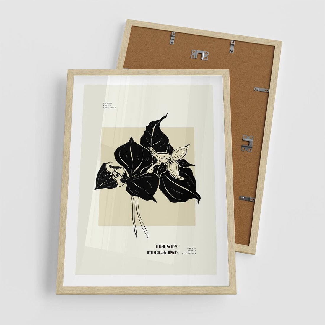 Elegancki minimalizm w połączeniu z kwiatową typografią. Monochromatyczne kolory i czarny kontur tworzą harmonijną kompozycję. Ten obraz przynosi do wnętrza subtelny akcent natury i estetycznej prostoty.