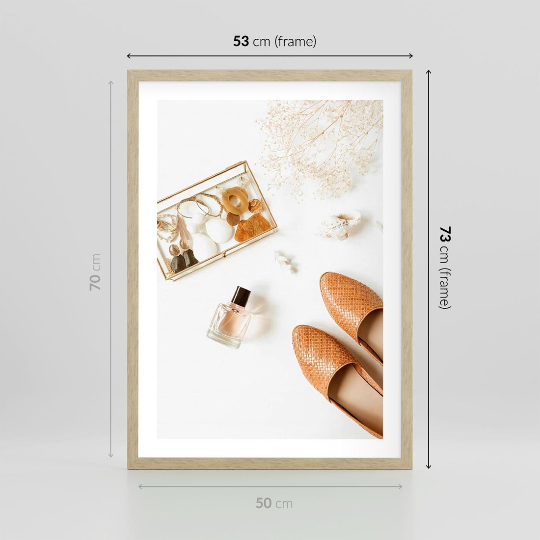 Plakat w ramie 50x70 - Elegancja w Szafie - modowa fotografia, buty - rama drewno