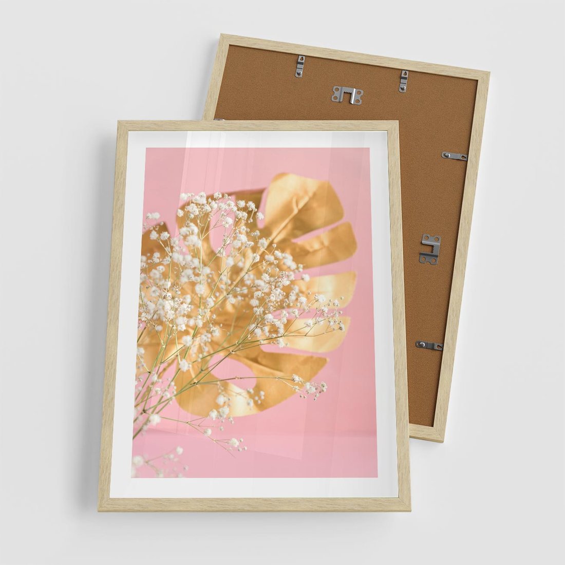 Plakat w ramie 50x70 - : Elegancja w Złocie - złote, liście - rama drewno