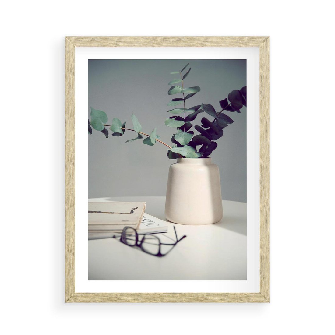 Obraz przedstawia kompozycję z liści eukaliptusa w wazonie, gazetą i okularami. Ta aranżacja oddaje atmosferę relaksu i czytania w spokojnym otoczeniu, doskonale pasując do wnętrz, które pragną wyrazić harmonię i spokój.