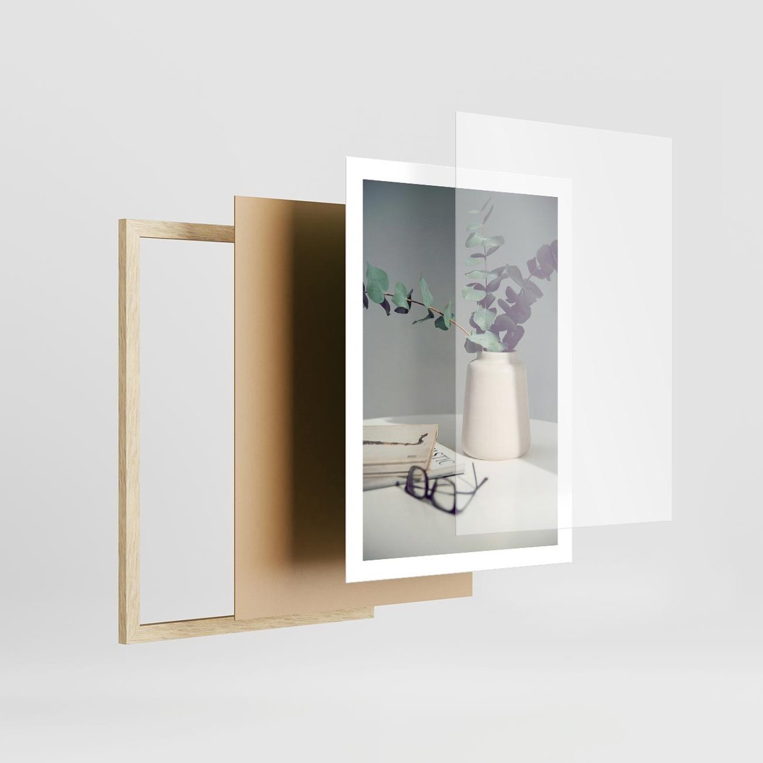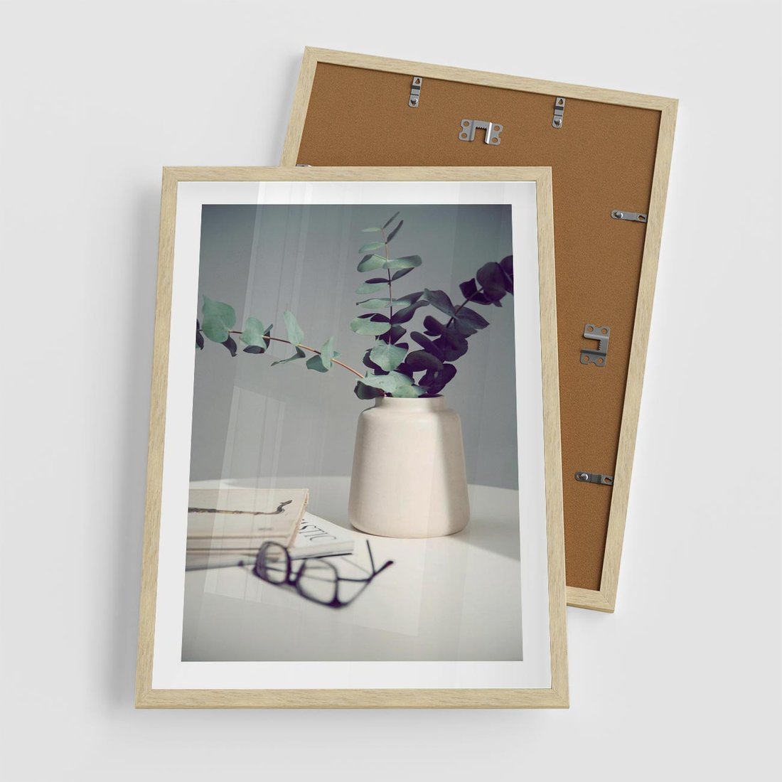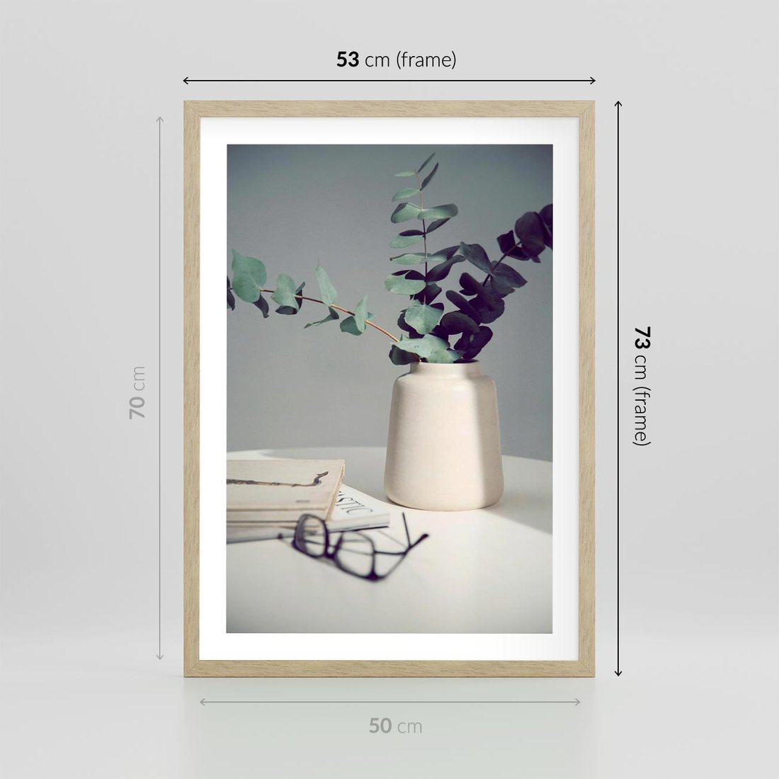 Plakat w ramie 50x70 - Eukaliptusowa Cisza - kompozycja, liście eukaliptusa w wazonie - rama drewno