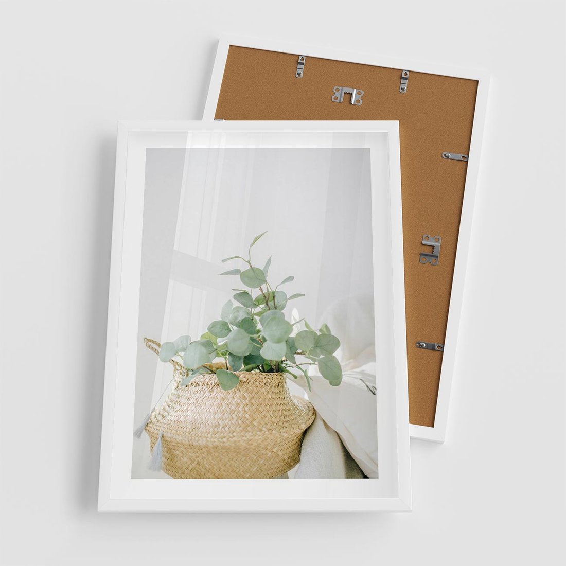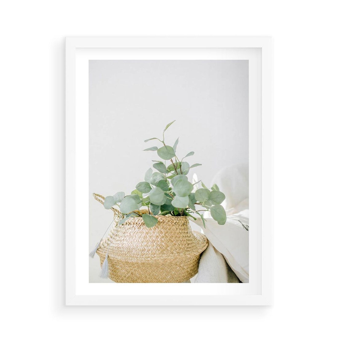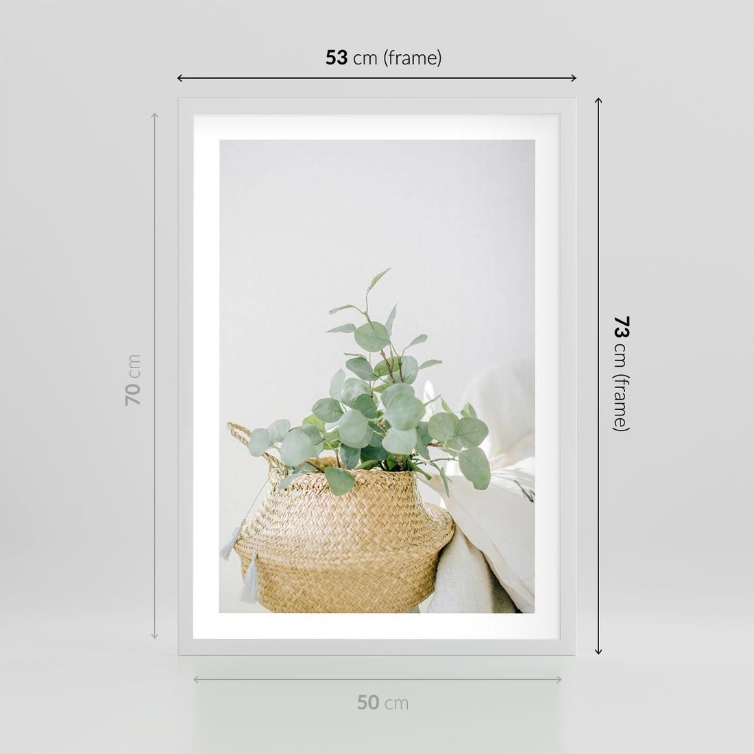 Plakat w ramie 50x70 - Eukaliptusowa Świeżość - eukaliptus, liście w koszu z wikliny - rama biała