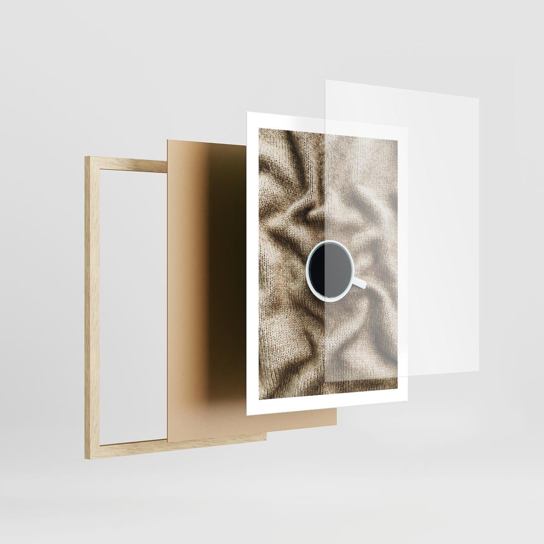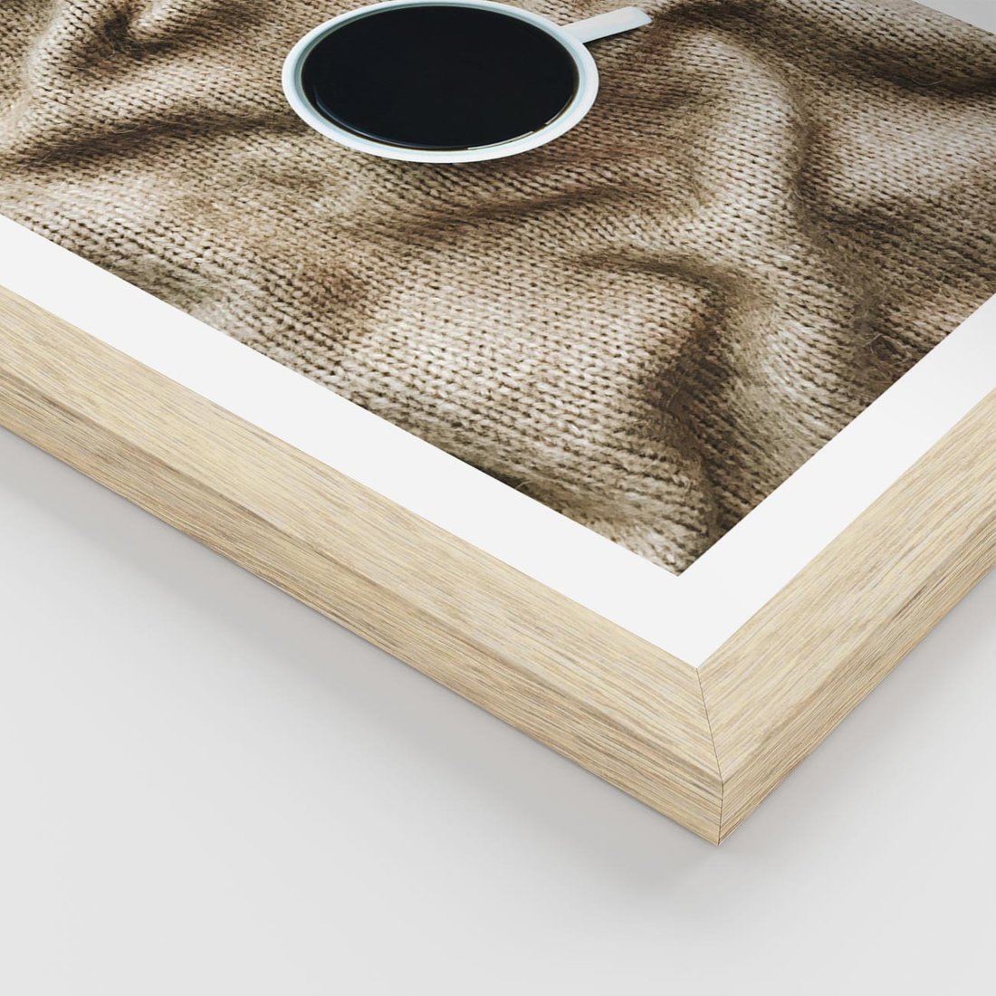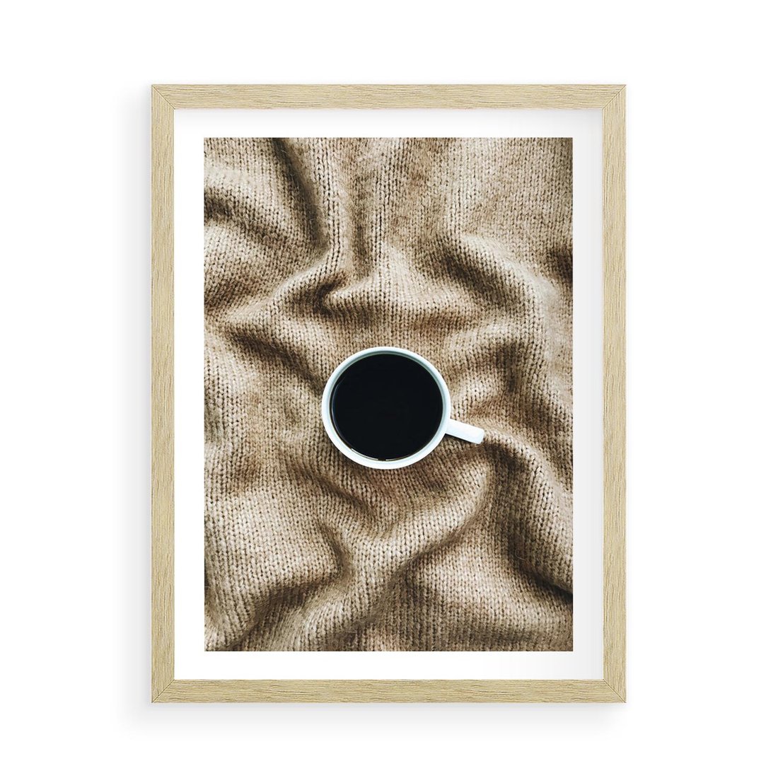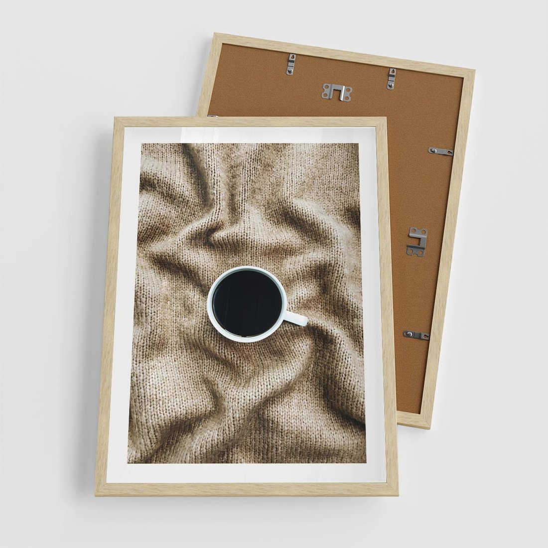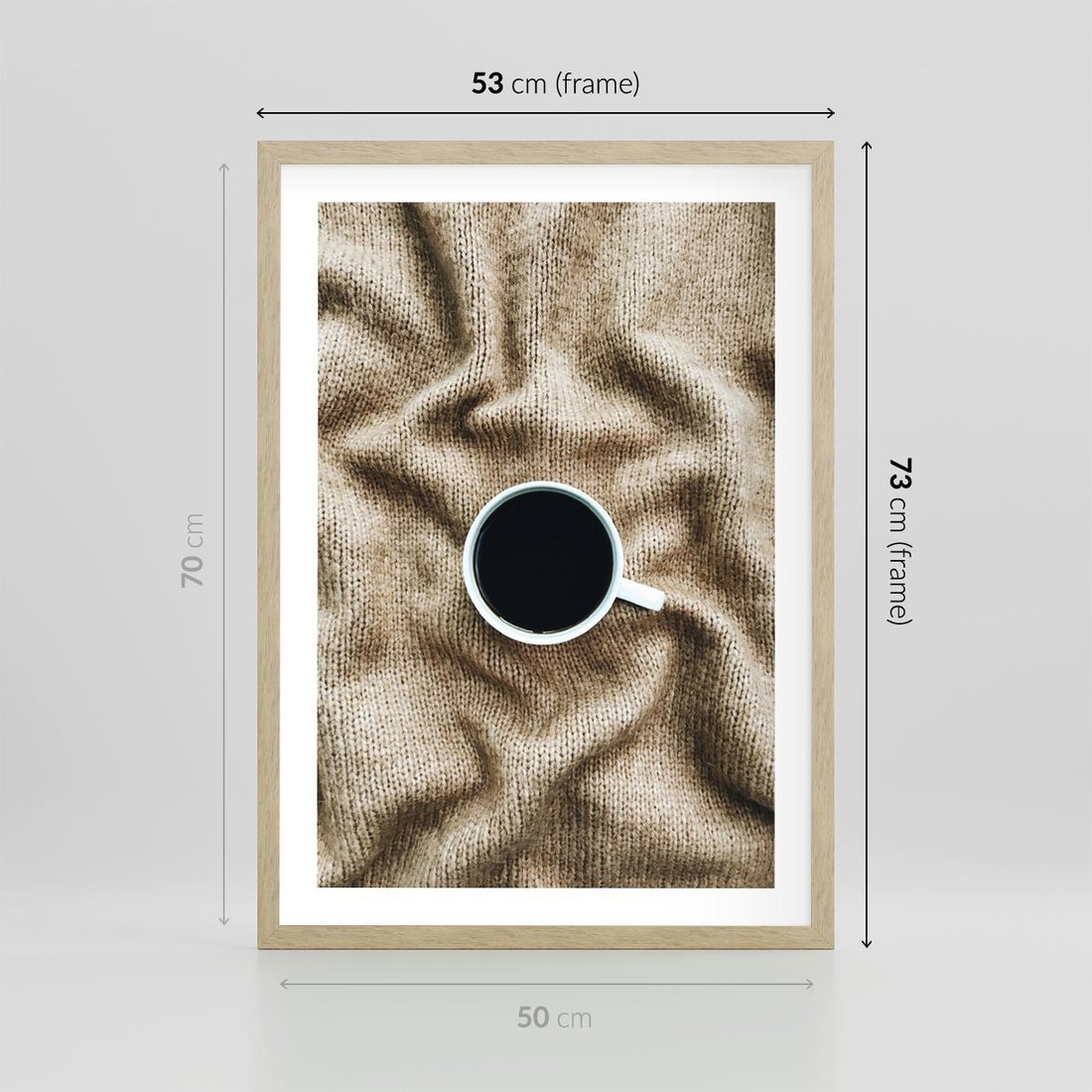 Plakat w ramie 50x70 - Filiżanka Kawy na Brązowym Kocu - kawa, czarna kawa - rama drewno