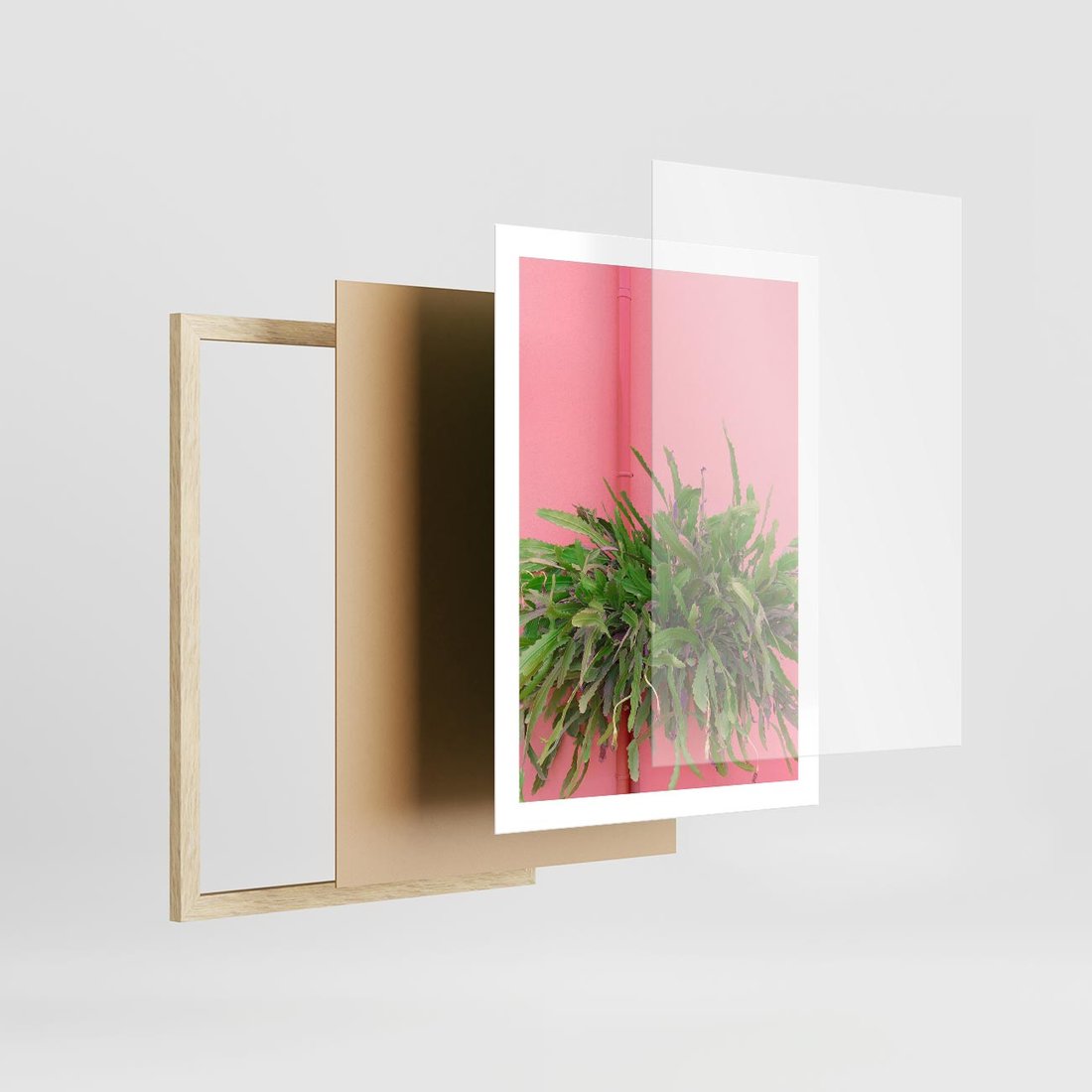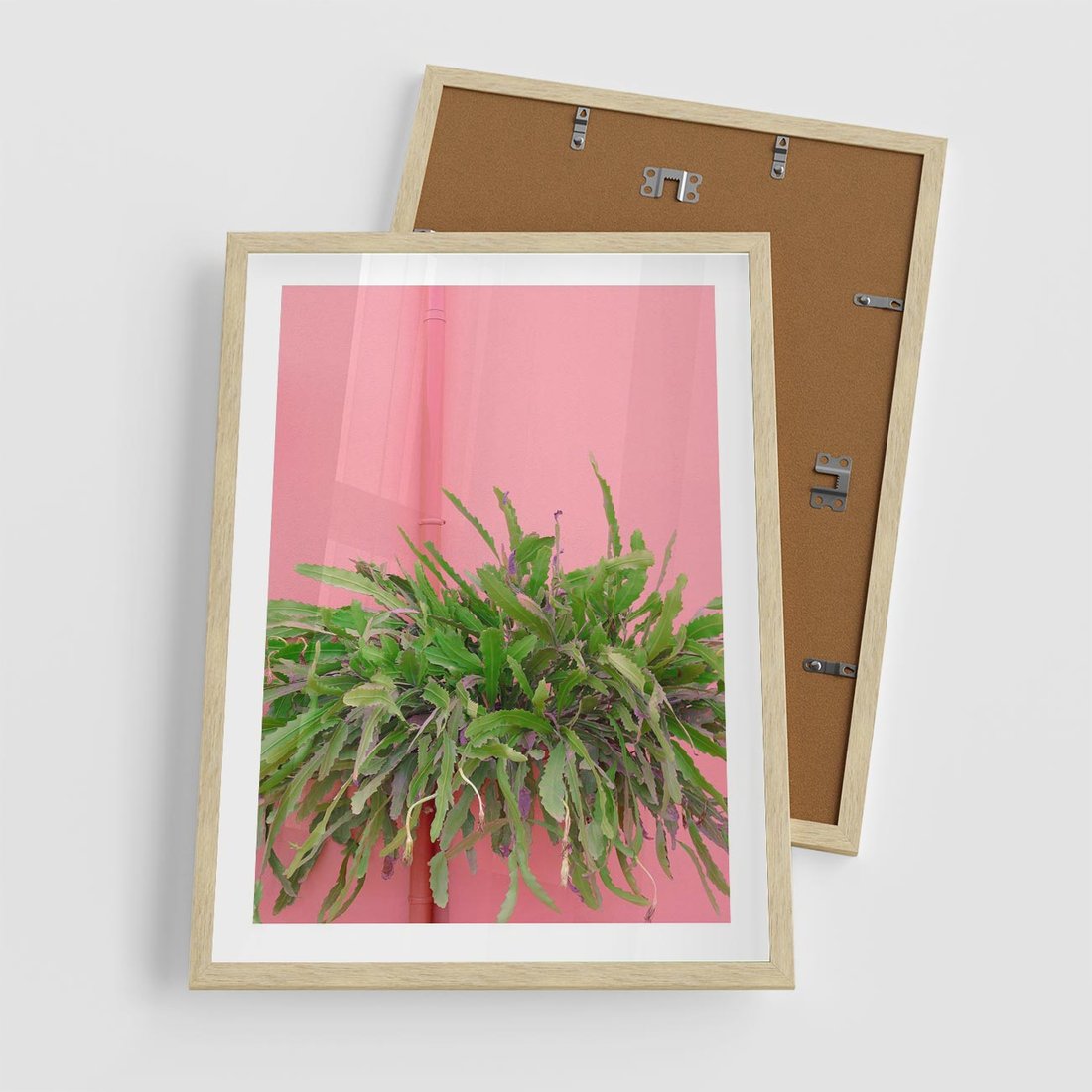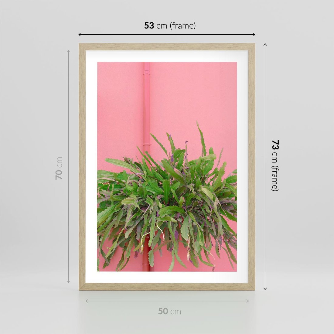 Plakat w ramie 50x70 - Fotografia Rośliny z Różowym Tłem - fotografia, zielona roślina na tle różwj ściany - rama drewno