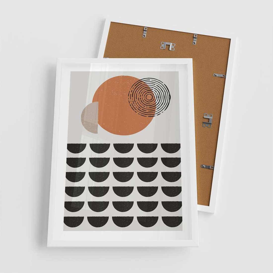 Plakat w ramie 50x70 - Geometryczna Ekspresja - geometryczny graficzny obraz, pomarańczowe koło - rama biała