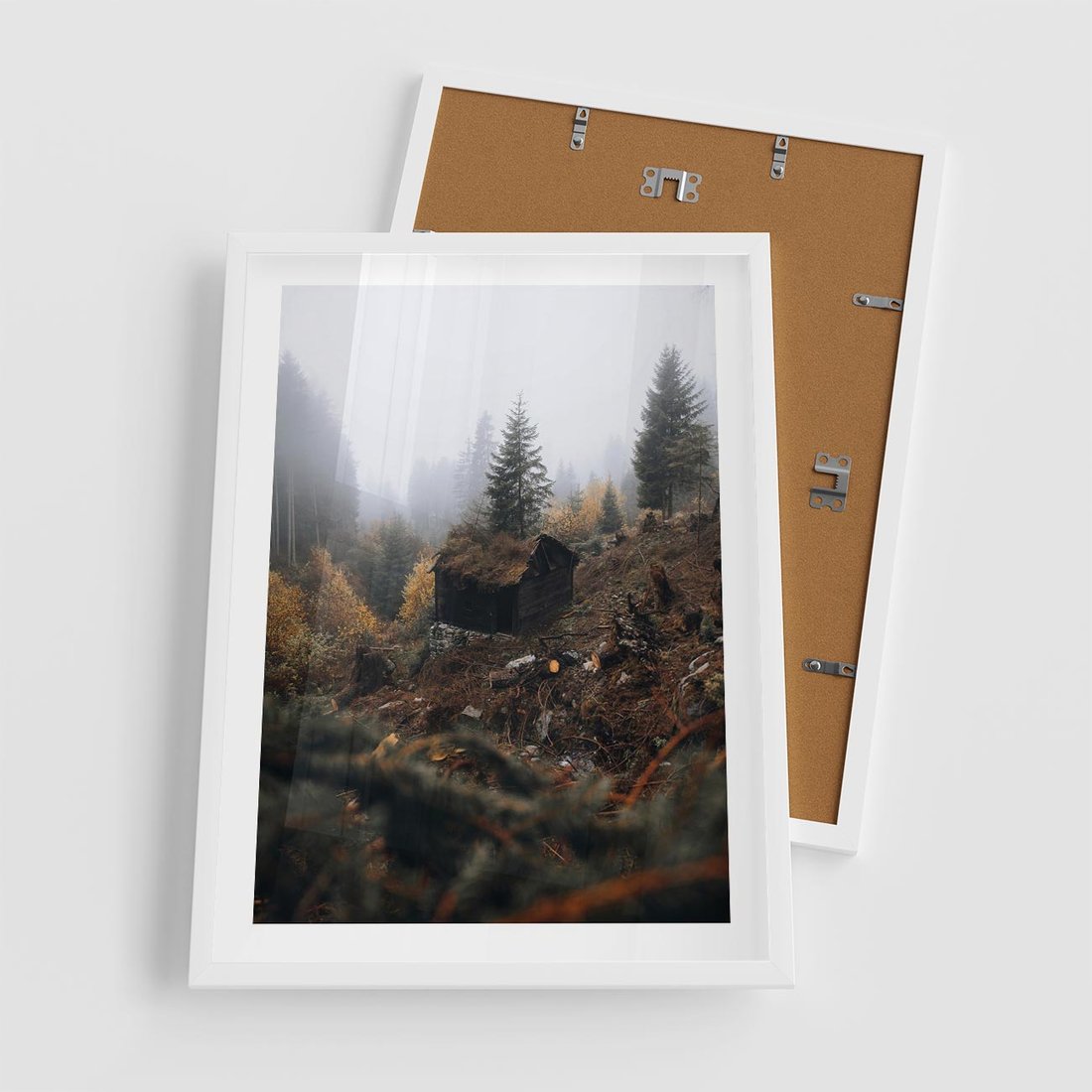 Plakat w ramie 50x70 - Górski las - stary zniszczony domek w górach, góry - rama biała