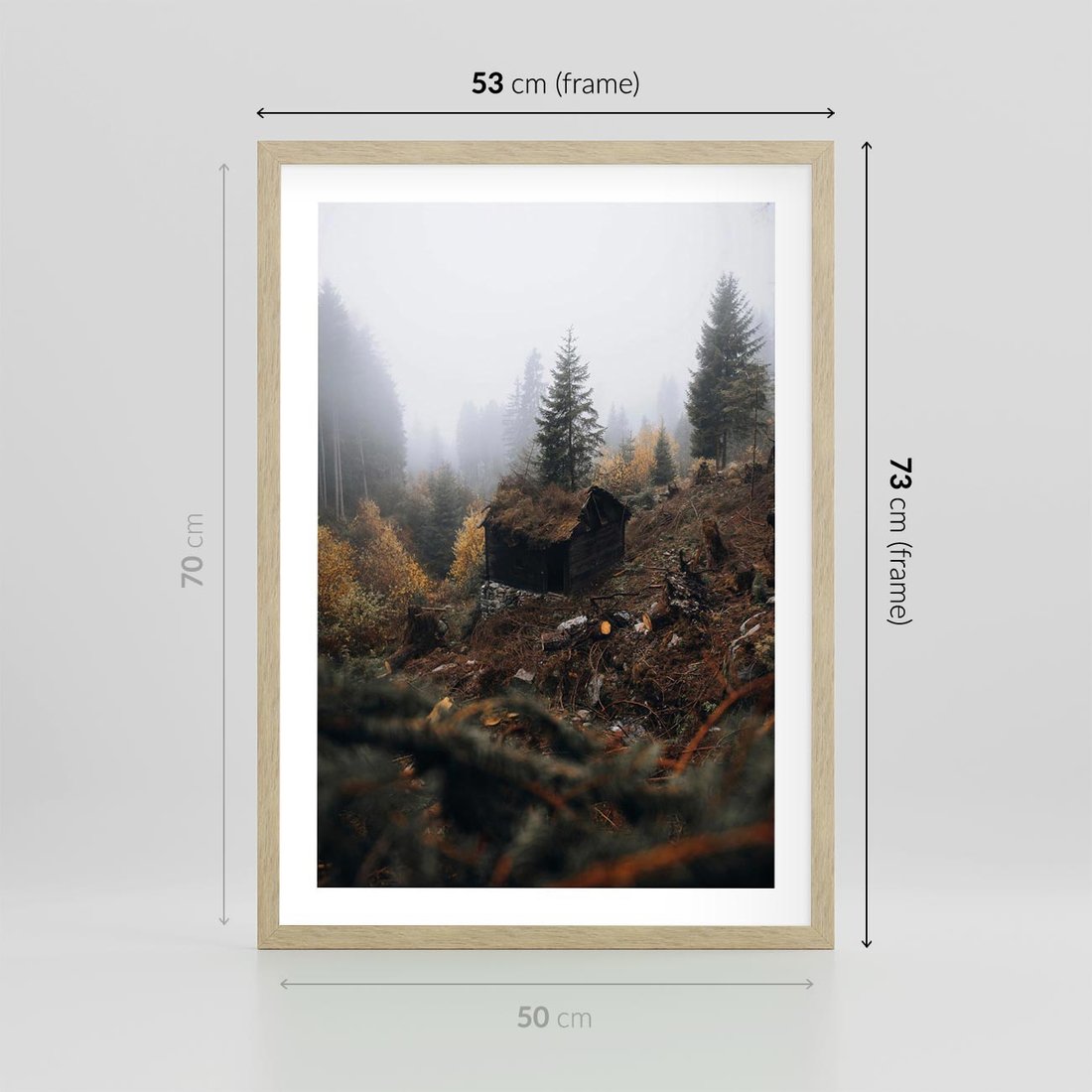 Plakat w ramie 50x70 - Górski las - stary zniszczony domek w górach, góry - rama drewno